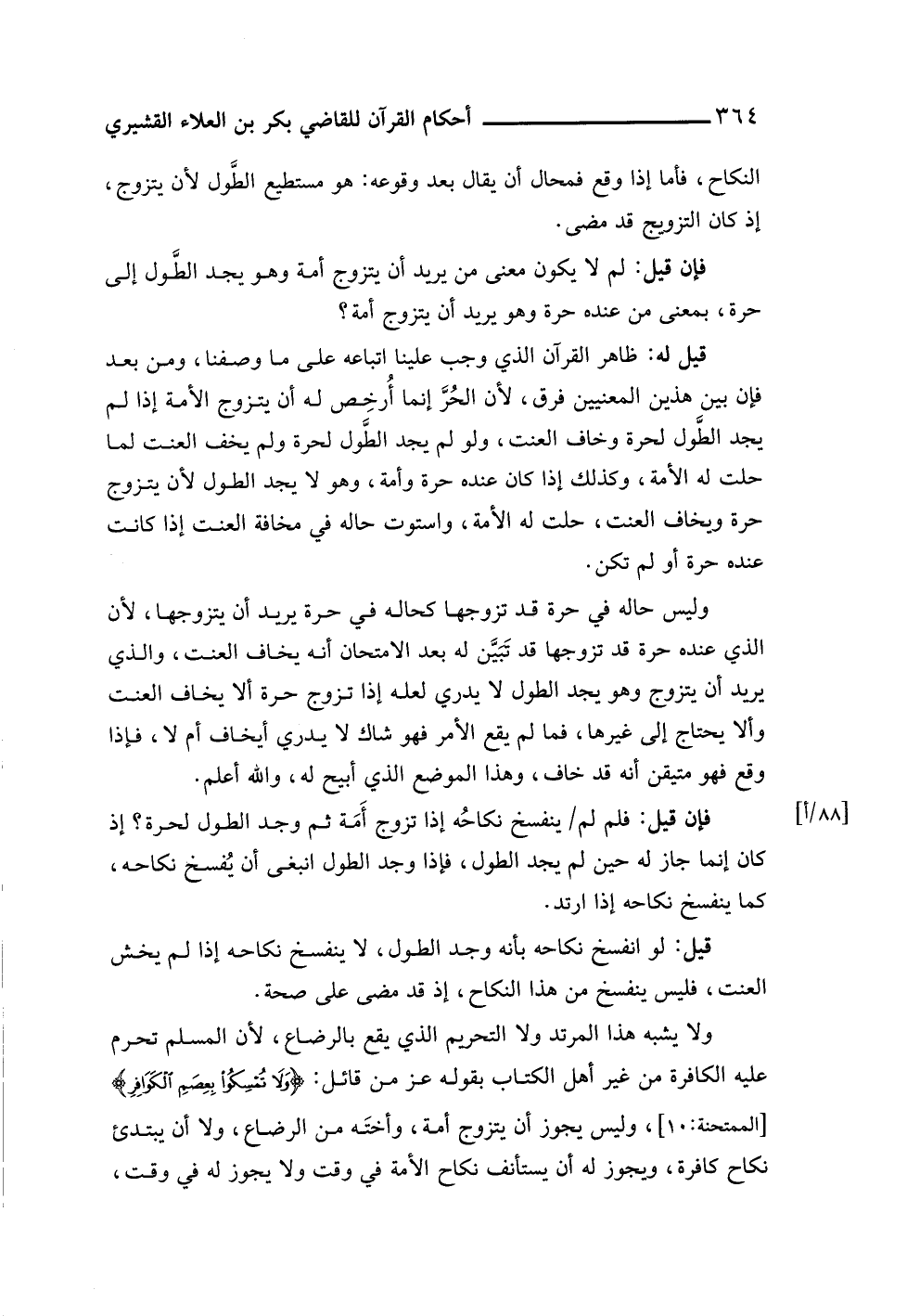 وليس حاله في حرة قد تزوجها كحاله في حرة يريد أن يتزوجها، لأن الذي عنده حرة قد تزوجها قد تَبَيَّن له بعد الامتحان أنه يخاف العنت، والذي يريد أن يتزوج وهو يجد الطول لا يدري لعله إذا تزوج حرة ألا يخاف العنت وألا يحتاج إلى غيرها، فما لم يقع الأمر فهو شاك لا يدري أيخاف أم لا، فإذا وقع فهو متيقن أنه قد خاف، وهذا الموضع الذي أبيح له، واللَّه أعلم.