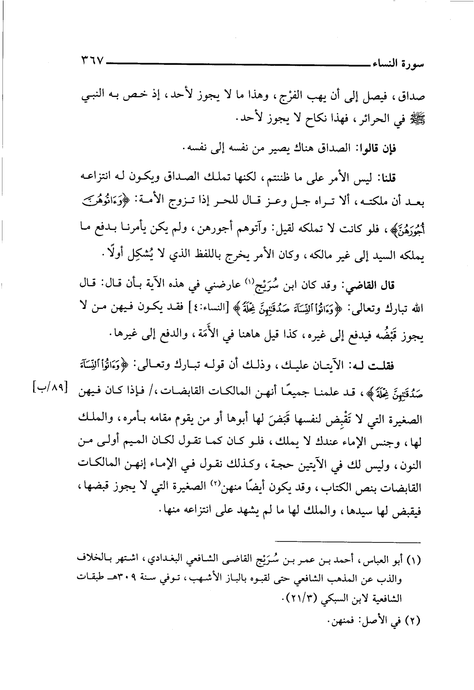 قال القاضي: وقد كان ابن سُرَيْج (¬١) عارضني في هذه الآية بأن قال: قال اللَّه تبارك وتعالى: {وَآتُوا النِّسَاءَ صَدُقَاتِهِنَّ نِحْلَةً} [النساء: ٤] فقد يكون فيهن من لا يجوز قَبْضُه فيدفع إلى غيره، كذا قيل هاهنا في الأَمَة، والدفع إلى غيرها.