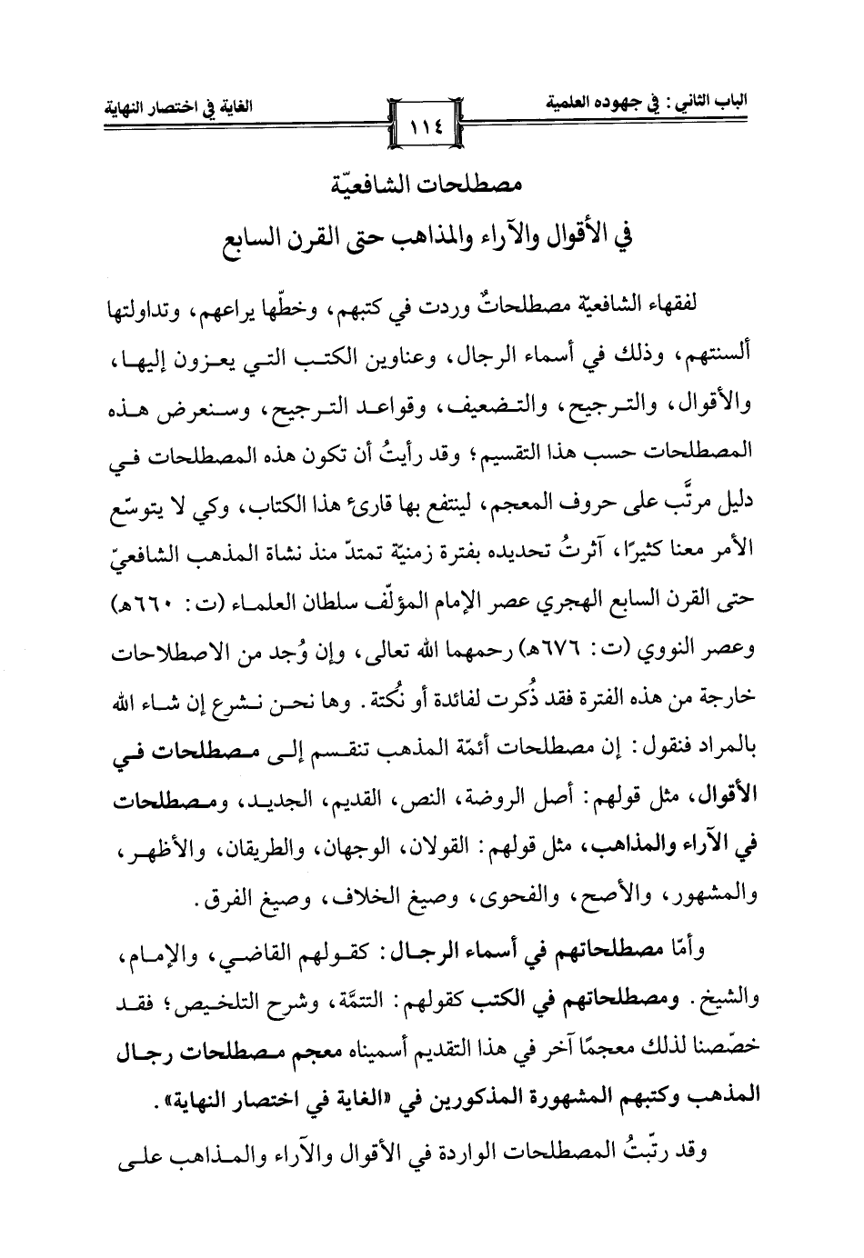 وأمّا مصطلحاتهم في أسماء الرجال: كقولهم القاضي، والإمام، والشيخ. ومصطلحاتهم في الكتب كقولهم: التتمَّة، وشرح التلخيص؛ فقد خصّصنا لذلك معجمًا آخر في هذا التقديم أسميناه معجم مصطلحات رجال المذهب وكتبهم المشهورة المذكورين في "الغاية في اختصار النهاية".