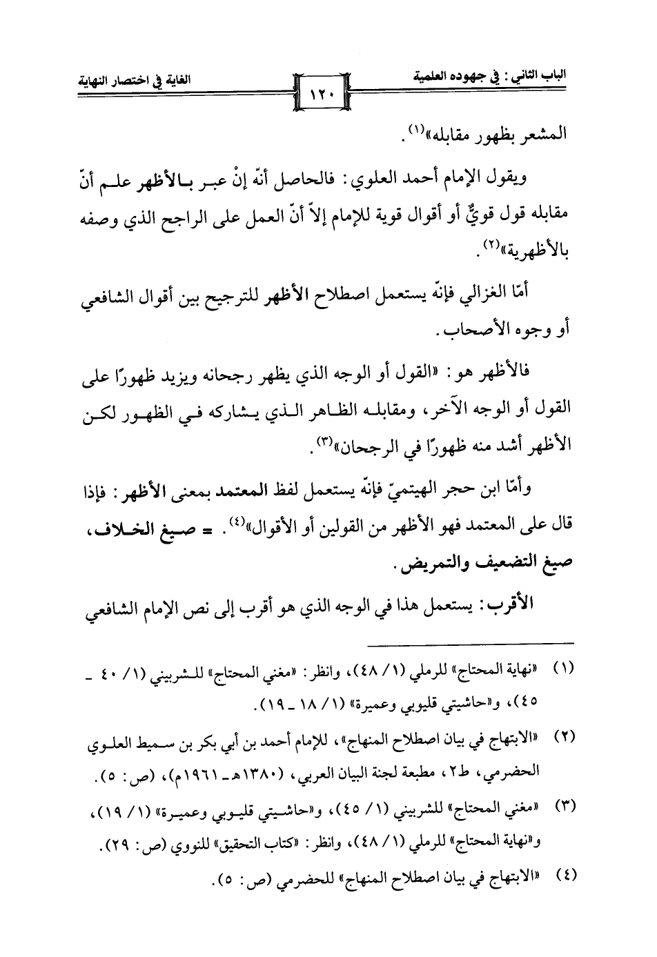 ويقول الإِمام أحمد العلوي: فالحاصل أنّه إنْ عبر بالأظهر علم أنّ مقابله قول قويٌّ أو أقوال قوية للإمام إلّا أنّ العمل على الراجح الذي وصفه بالأظهرية" (¬2).