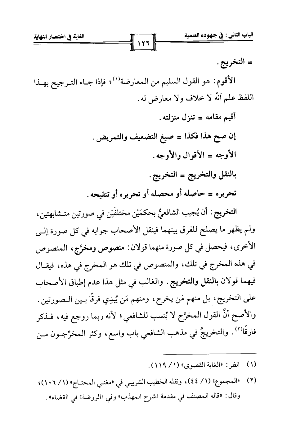 التخريج: أن يُجيب الشافعيُّ بحكمَيْن مختلفَيْن في صورتين متشابهتين، ولم يظهر ما يصلح للفرق بينهما فينقل الأصحاب جوابه في كل صورة إلى الأخرى، فيحصل في كل صورة منهما قولان: منصوص ومخرَّج، المنصوص في هذه المخرج في تلك، والمنصوص في تلك هو المخرج في هذه، فيقال فيهما قولان بالنقل والتخريج. والغالب في مثل هذا عدم إطباق الأصحاب على التخريج، بل منهم مَن يخرج، ومنهم مَن يُبدِي فرقًا بين الصورتين. والأصح أنَّ القول المخرَّج لا يُنسب للشافعي؛ لأنه ربما روجع فيه، فذكر فارقًا (¬2). والتخريجُ في مذهب الشافعي باب واسع، وكثر المخرِّجون من