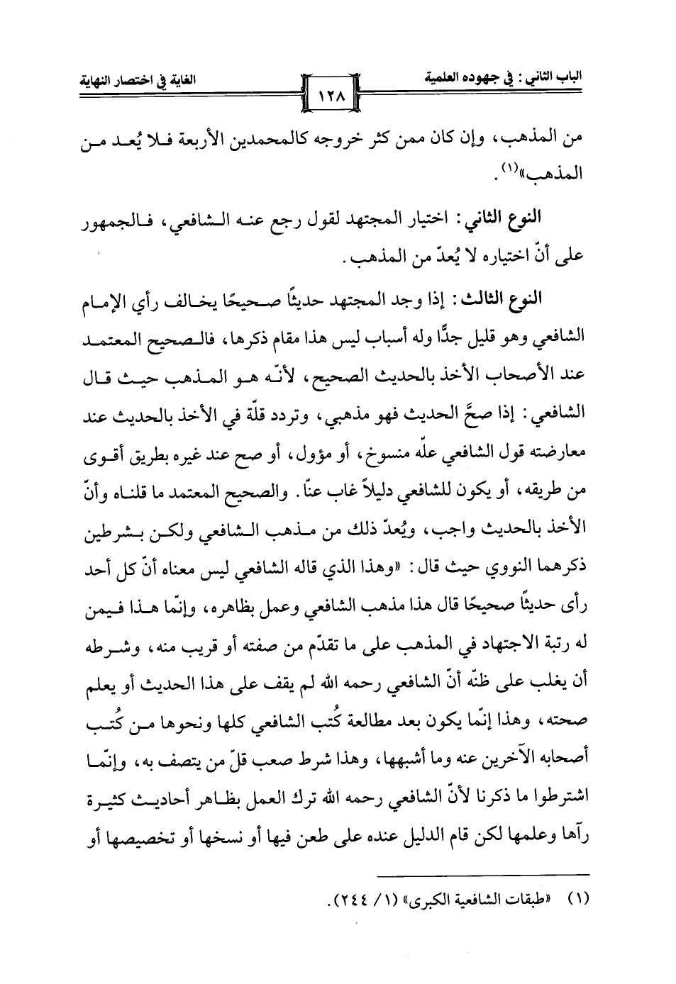 النوع الثالث: إذا وجد المجتهد حديثًا صحيحًا يخالف رأي الإِمام الشافعي وهو قليل جدًّا وله أسباب ليس هذا مقام ذكرها، فالصحيح المعتمد عند الأصحاب الأخذ بالحديث الصحيح, لأنّه هو المذهب حيث قال الشافعي: إذا صحَّ الحديث فهو مذهبي، وتردد قلة في الأخذ بالحديث عند معارضته قول الشافعي علّه منسوخ، أو مؤول، أو صح عند غيره بطريق أقوى من طريقه، أو يكون للشافعي دليلًا غاب عنّا. والصحيح المعتمد ما قلناه وأنّ الأخذ بالحديث واجب، ويُعدّ ذلك من مذهب الشافعي ولكن بشرطين ذكرهما النووي حيث قال: "وهذا الذي قاله الشافعي ليس معناه أنّ كل أحد رأى حديثًا صحيحًا قال هذا مذهب الشافعي وعمل بظاهره، وإنّما هذا فيمن له رتبة الاجتهاد في المذهب على ما تقدّم من صفته أو قريب منه، وشرطه أن يغلب على ظنّه أنّ الشافعي رحمه الله لم يقف على هذا الحديث أو يعلم صحته، وهذا إنّما يكون بعد مطالعة كُتب الشافعي كلها ونحوها من كُتب أصحابه الآخرين عنه وما أشبهها، وهذا شرط صعب قلّ من يتصف به، وإنّما اشترطوا ما ذكرنا لأنّ الشافعي رحمه الله ترك العمل بظاهر أحاديث كثيرة رآها وعلمها لكن قام الدليل عنده على طعن فيها أو نسخها أو تخصيصها أو