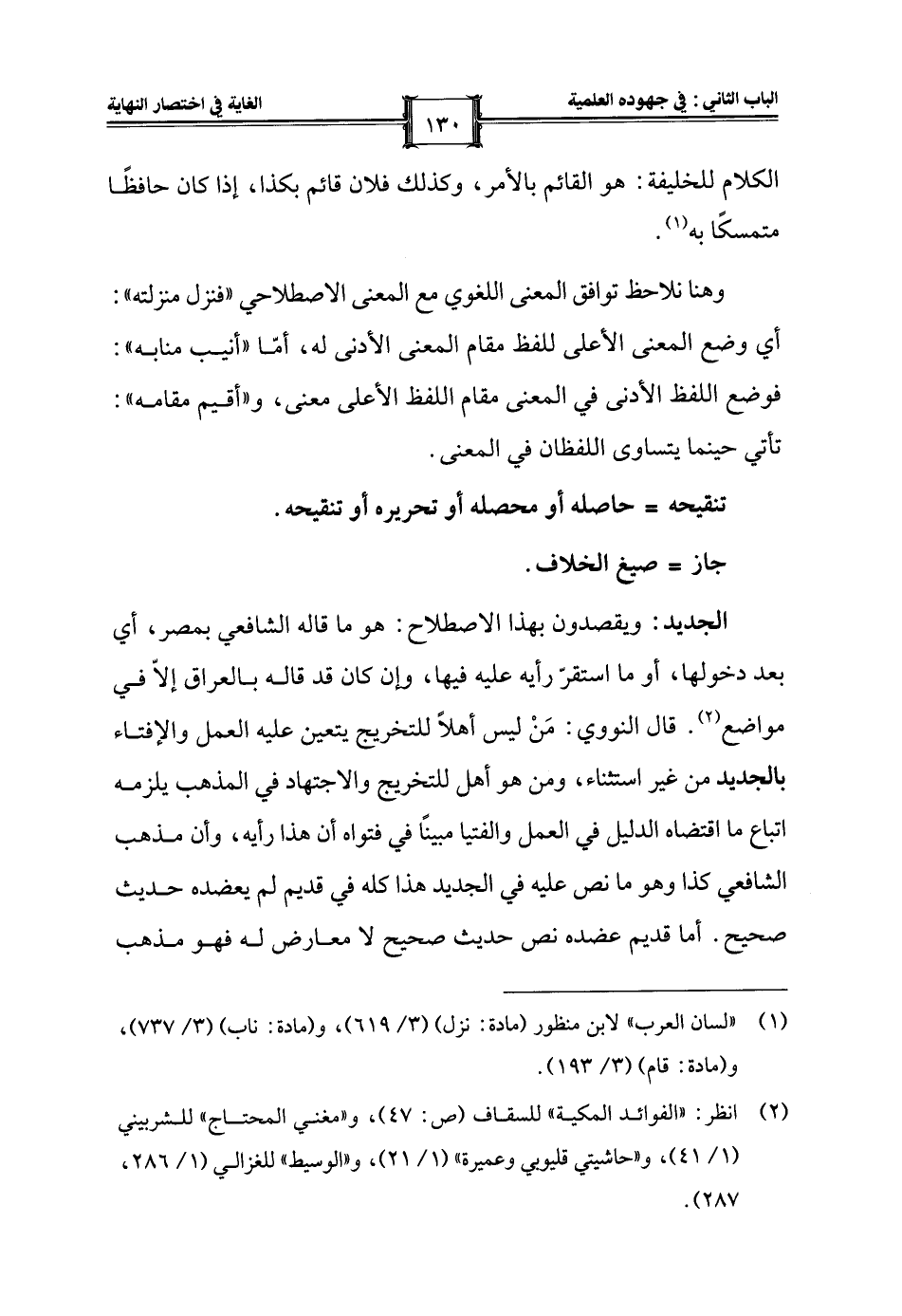 الجديد: ويقصدون بهذا الاصطلاح: هو ما قاله الشافعي بمصر، أي بعد دخولها، أو ما استقرّ رأيه عليه فيها، وإن كان قد قاله بالعراق إلّا في مواضع (¬2). قال النووي: مَنْ ليس أهلًا للتخريج يتعين عليه العمل والإفتاء بالجديد من غير استثناء، ومن هو أهل للتخريج والاجتهاد في المذهب يلزمه اتباع ما اقتضاه الدليل في العمل والفتيا مبينًا في فتواه أن هذا رأيه، وأن مذهب الشافعي كذا وهو ما نص عليه في الجديد هذا كله في قديم لم يعضده حديث صحيح. أما قديم عضده نص حديث صحيح لا معارض له فهو مذهب