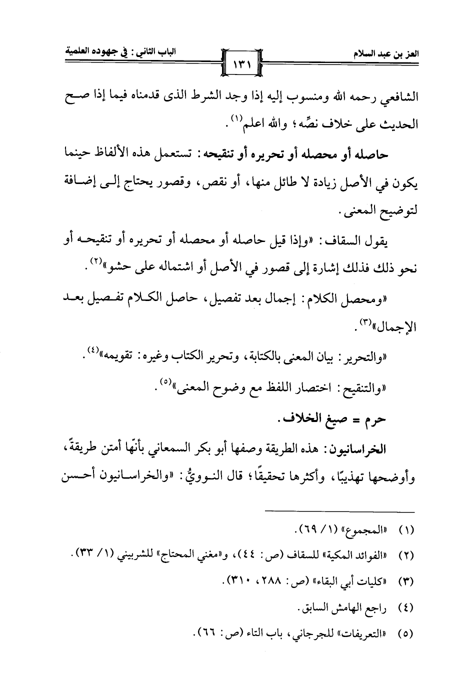 يقول السقاف: "وإذا قيل حاصله أو محصله أو تحريره أو تنقيحه أو نحو ذلك فذلك إشارة إلى قصور في الأصل أو اشتماله على حشو" (¬2).