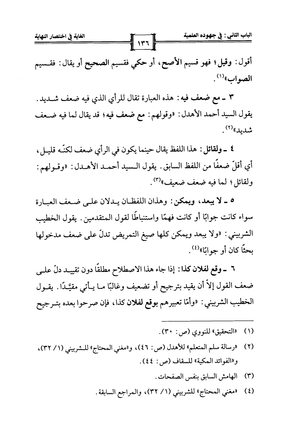 5 - لا يبعد، ويمكن: وهذان اللفظان يدلان على ضعف العبارة سواء كانت جوابًا أو كانت فهمًا واستنباطًا لقول المتقدمين. يقول الخطيب الشربيني: "ولا يبعد ويمكن كلها صيغ التمريض تدلّ على ضعف مدخولها بحثًا كان أو جوابًا" (¬4).