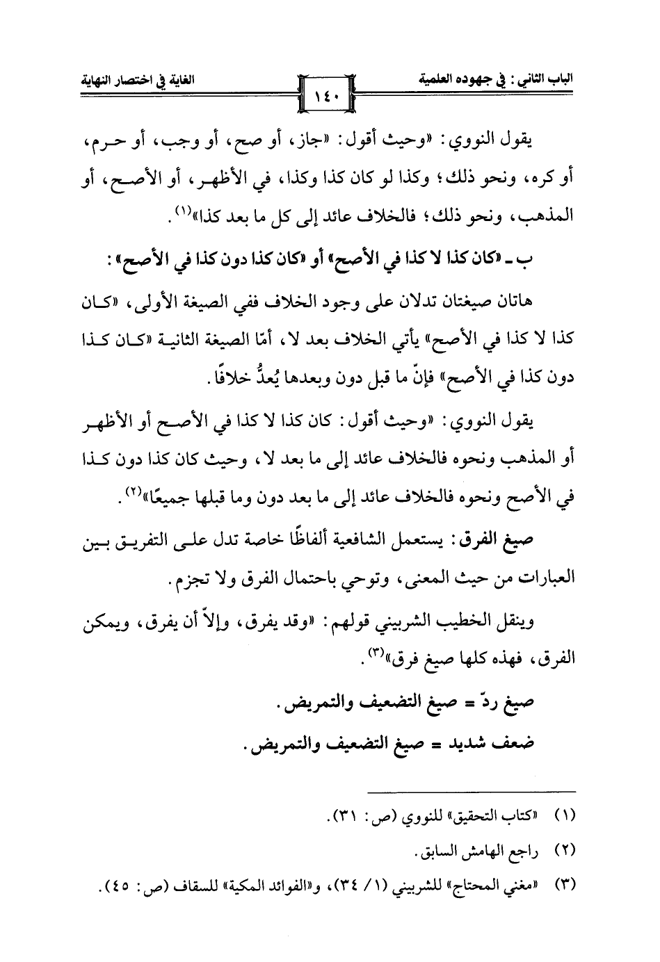 يقول النووي: "وحيث أقول: "جاز، أو صح، أو وجب، أو حرم، أو كره، ونحو ذلك؛ وكذا لو كان كذا وكذا، في الأظهر، أو الأصح، أو المذهب، ونحو ذلك؛ فالخلاف عائد إلى كل ما بعد كذا" (¬1).