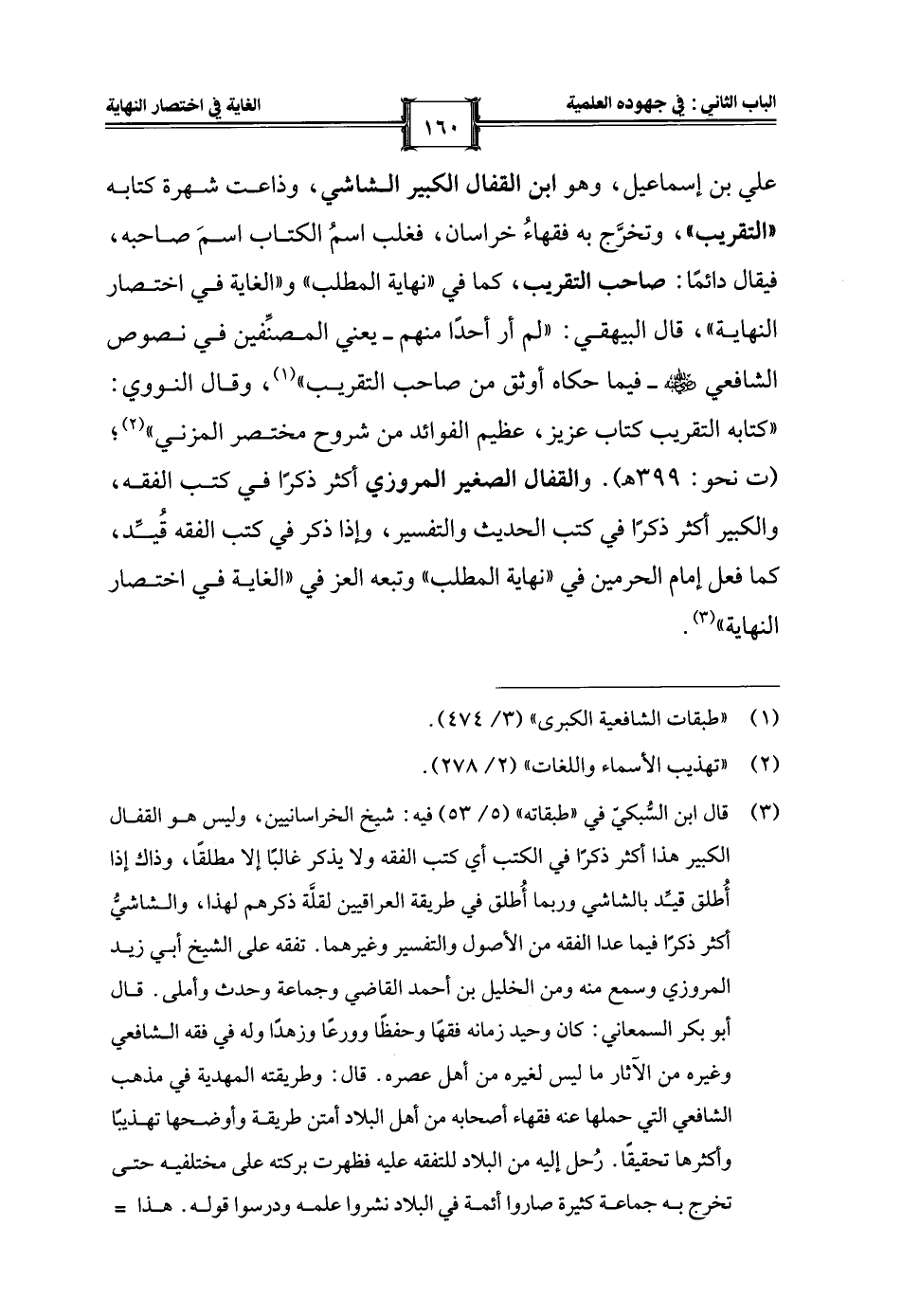 علي بن إسماعيل، وهو ابن القفال الكبير الشاشي، وذاعت شهرة كتابه "التقريب"، وتخرَّج به فقهاءُ خراسان، فغلب اسمُ الكتاب اسمَ صاحبه، فيقال دائمًا: صاحب التقريب، كما في "نهاية المطلب" و"الغاية في اختصار النهاية"، قال البيهقي: "لم أر أحدًا منهم -يعني المصنِّفين في نصوص الشافعي - رضي الله عنه - فيما حكاه أوثق من صاحب التقريب" (¬1)، وقال النووي: "كتابه التقريب كتاب عزيز، عظيم الفوائد من شروح مختصر المزني" (¬2)؛ (ت نحو: 399 هـ). والقفال الصغير المروزي أكثر ذكرًا في كتب الفقه، والكبير أكثر ذكرًا في كتب الحديث والتفسير، وإذا ذكر في كتب الفقه قُيِّد، كما فعل إمام الحرمين في "نهاية المطلب" وتبعه العز في "الغاية في اختصار النهاية" (¬3).