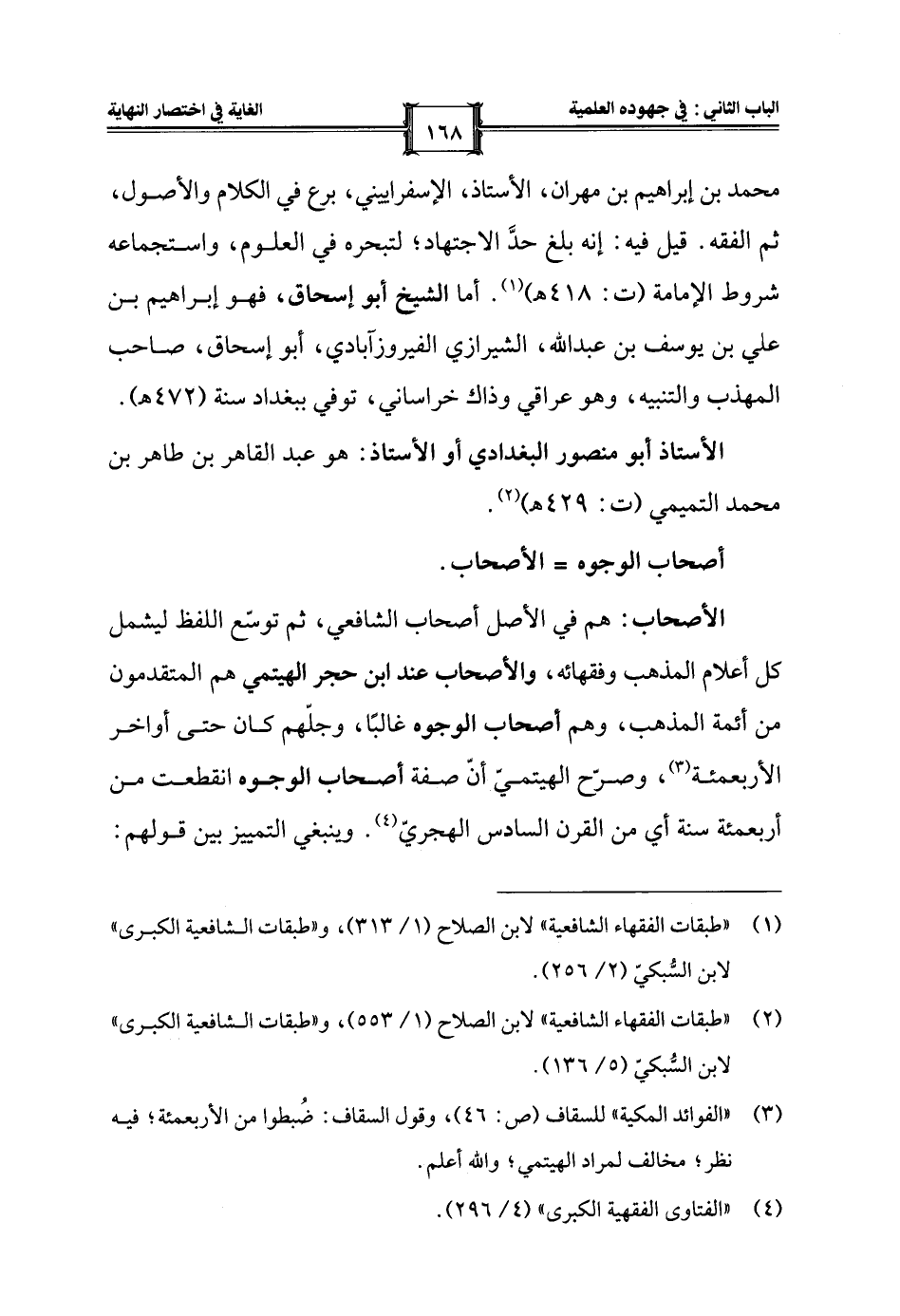 محمد بن إبراهيم بن مهران، الأستاذ، الإسفراييني، برع في الكلام والأصول، ثم الفقه. قيل فيه: إنه بلغ حدَّ الاجتهاد؛ لتبحره في العلوم، واستجماعه شروط الإمامة (ت: 418 هـ) (¬1). أما الشيخ أبو إسحاق، فهو إبراهيم بن علي بن يوسف بن عبد الله، الشيرازي الفيروزآبادي، أبو إسحاق، صاحب المهذب والتنبيه، وهو عراقي وذاك خراساني، توفي ببغداد سنة (472 هـ).