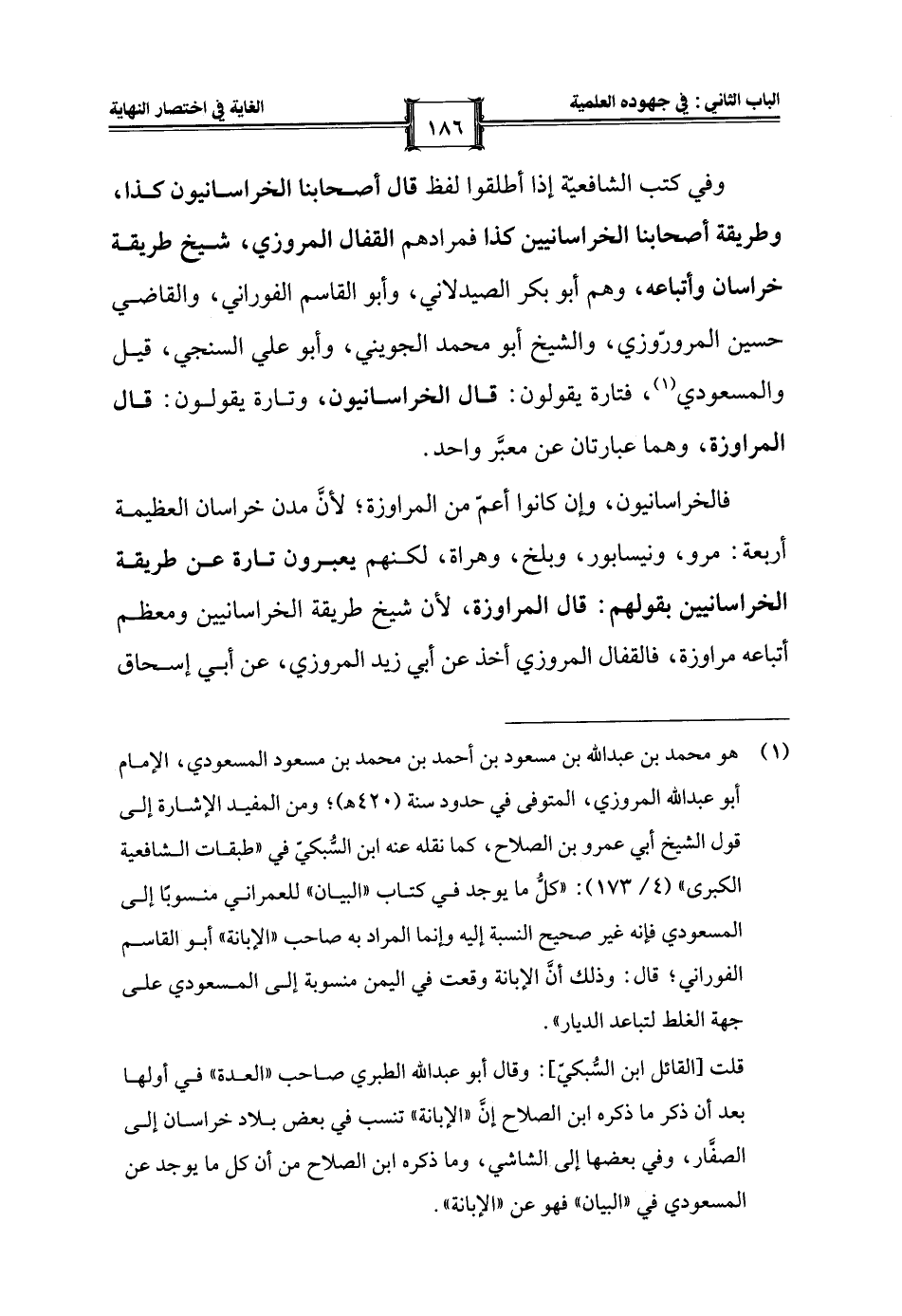 وفي كتب الشافعيّة إذا أطلقوا لفظ قال أصحابنا الخراسانيون كذا، وطريقة أصحابنا الخراسانيين كذا فمرادهم القفال المروزي، شيخ طريقة خراسان وأتباعه، وهم أبو بكر الصيدلاني، وأبو القاسم الفوراني، والقاضي حسين المرورّوزي، والشيخ أبو محمد الجويني، وأبو علي السنجي، قيل والمسعودي (¬1)، فتارة يقولون: قال الخراسانيون، وتارة يقولون: قال المراوزة، وهما عبارتان عن معبَّر واحد.
