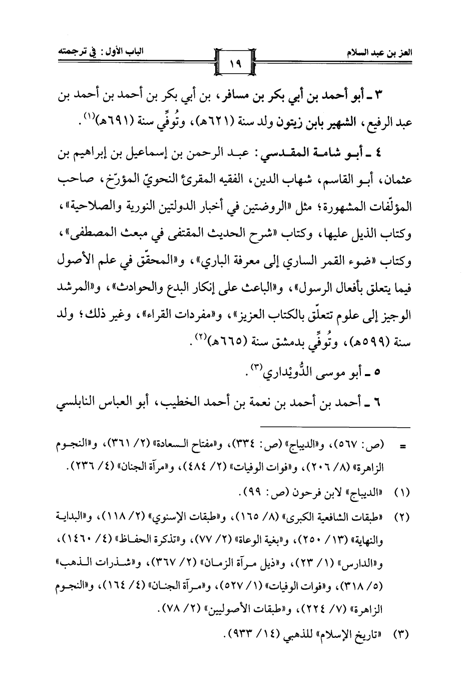 4 - أبو شامة المقدسي: عبد الرحمن بن إسماعيل بن إبراهيم بن عثمان، أبو القاسم، شهاب الدين، الفقيه المقرئ النحويّ المؤرّخ، صاحب المؤلّفات المشهورة؛ مثل "الروضتين في أخبار الدولتين النورية والصلاحية"، وكتاب الذيل عليها، وكتاب "شرح الحديث المقتفى في مبعث المصطفى"، وكتاب "ضوء القمر الساري إلى معرفة الباري"، و"المحقّق في علم الأصول فيما يتعلق بأفعال الرسول"، و"الباعث على إنكار البدع والحوادث"، و"المرشد الوجيز إلى علوم تتعلّق بالكتاب العزيز"، و"مفردات القراء"، وغير ذلك؛ ولد سنة (599 هـ)، وتُوفِّي بدمشق سنة (665 هـ) (¬2).