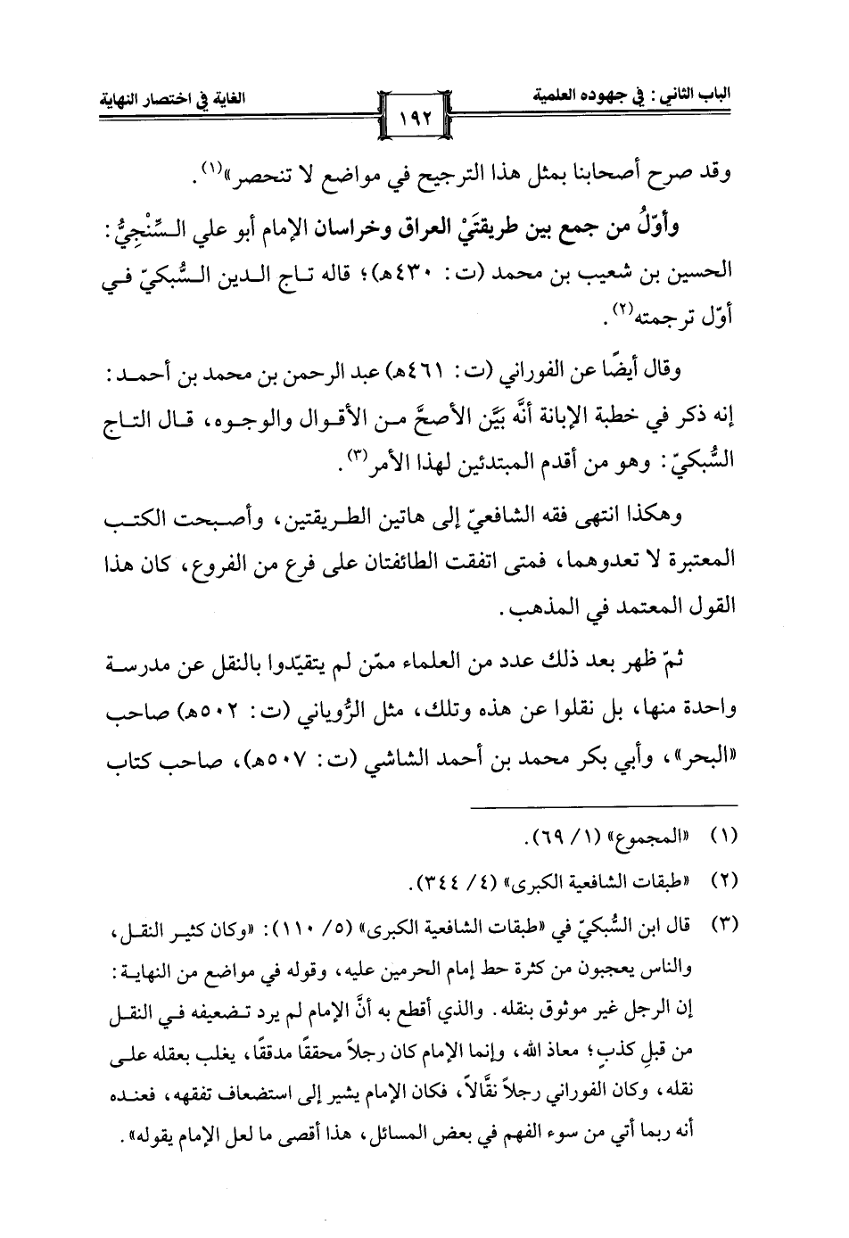 (¬3) قال ابن السُّبكيّ في "طبقات الشافعية الكبرى" (5/ 110): "وكان كثير النقل، والناس يعجبون من كثرة حط إمام الحرمين عليه، وقوله في مواضع من النهاية: إن الرجل غير موثوق بنقله. والذي أقطع به أنَّ الإِمام لم يرد تضعيفه في النقل من قبلِ كذبٍ؛ معاذ الله، وإنما الإِمام كان رجلًا محققًا مدققًا، يغلب بعقله على نقله، وكان الفوراني رجلًا نقَّالًا، فكان الإِمام يشير إلى استضعاف تفقهه، فعنده أنه ربما أتي من سوء الفهم في بعض المسائل، هذا أقصى ما لعل الإِمام يقوله".