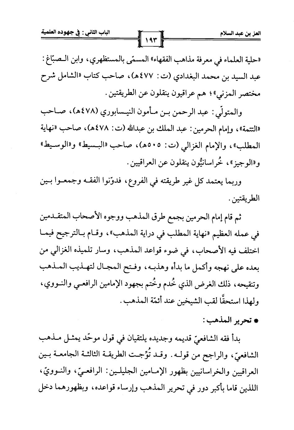 ثم قام إمام الحرمين بجمع طرق المذهب ووجوه الأصحاب المتقدمين في عمله العظيم "نهاية المطلب في دراية المذهب"، وقام بالترجيح فيما اختلف فيه الأصحاب، في ضوء قواعد المذهب، وسار تلميذه الغزالي من بعده على نهجه وأكمل ما بدأه وهذبه، وفتح المجال لتهذيب المذهب وتنقيحه، ذلك الغرض الذي خُدم وخُتم بجهود الإمامين الرافعي والنووي، ولهذا استحقَّا لقب الشيخين عند أئمة المذهب.