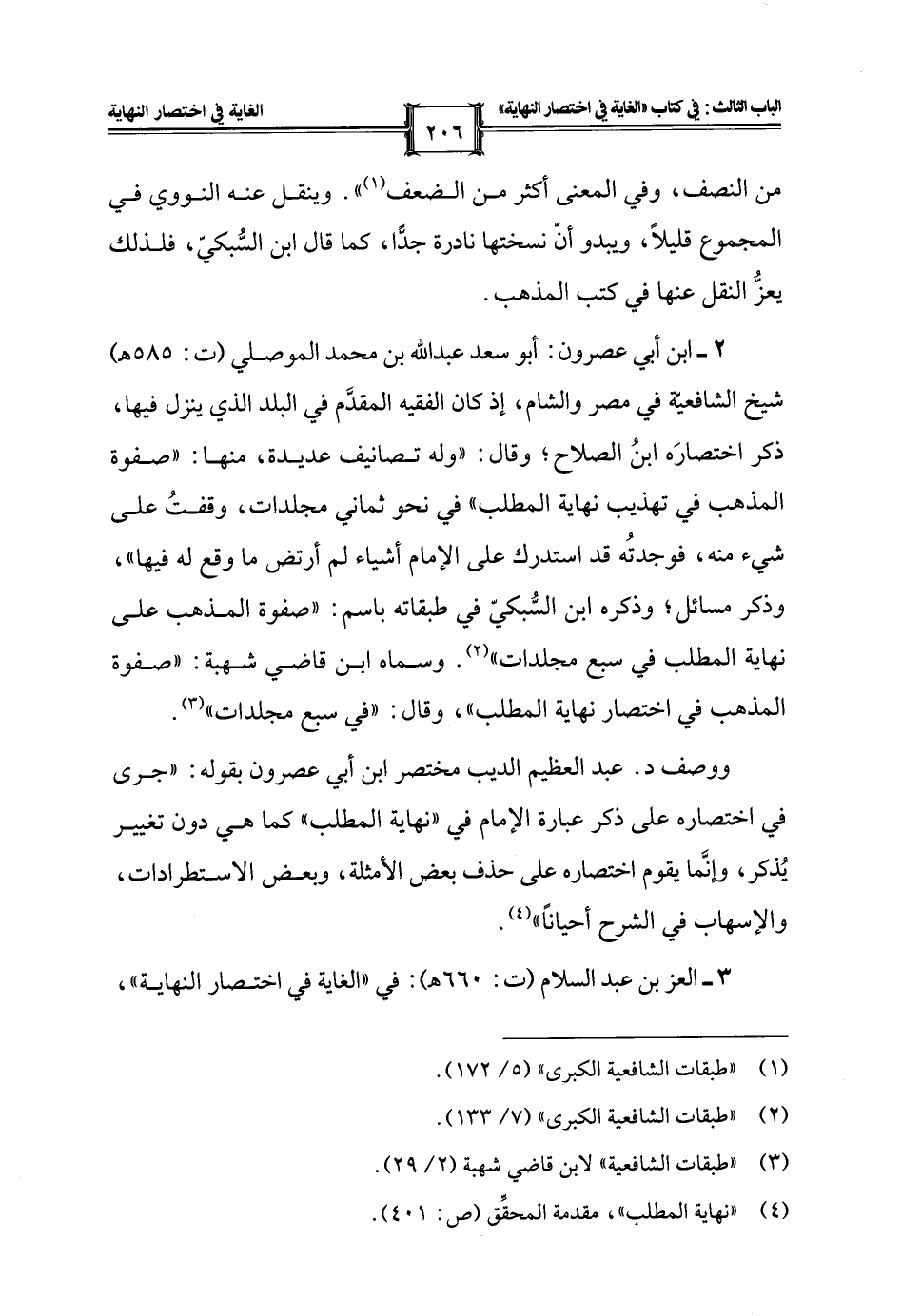 2 - ابن أبي عصرون: أبو سعد عبد الله بن محمد الموصلي (ت: 585 هـ) شيخ الشافعية في مصر والشام، إذ كان الفقيه المقدَّم في البلد الذي ينزل فيها، ذكر اختصارَه ابنُ الصلاح؛ وقال: "وله تصانيف عديدة، منها: "صفوة المذهب في تهذيب نهاية المطلب" في نحو ثماني مجلدات، وقفتُ على شيء منه، فوجدتُه قد استدرك على الإمام أشياء لم أرتض ما وقع له فيها"، وذكر مسائل؛ وذكره ابن السُّبكيّ في طبقاته باسم: "صفوة المذهب على نهاية المطلب في سبع مجلدات" (¬2). وسماه ابن قاضي شهبة: "صفوة المذهب في اختصار نهاية المطلب"، وقال: "في سبع مجلدات" (¬3).