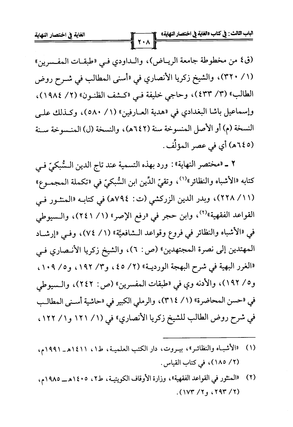 2 - "مختصر النهاية": ورد بهذه التسمية عند تاج الدين السُّبكيّ في كتابه "الأشباه والنظائر" (¬1)، وتقيّ الدِّين ابن السُّبكيّ في "تكملة المجموع" (11/ 228)، وبدر الدين الزركشي (ت: 794 هـ) في كتابه "المنثور في القواعد الفقهية" (¬2)، وابن حجر في "رفع الإصر" (1/ 241)، والسيوطي في "الأشباه والنظائر في فروع وقواعد الشافعيَّة" (1/ 74)، وفي "إرشاد المهتدين إلى نصرة المجتهدين" (ص: 6)، والشيخ زكريا الأنصاري في "الغرر البهية في شرح البهجة الوردية" (2/ 45، و 3/ 192، و 5/ 109، و 5/ 192)، والأدنه وي في "طبقات المفسرين" (ص: 242)، والسيوطي في "حسن المحاضرة" (1/ 314)، والرملي الكبير في "حاشية أسنى المطالب في شرح روض الطالب للشيخ زكريا الأنصاري" في (1/ 121 و 1/ 122،