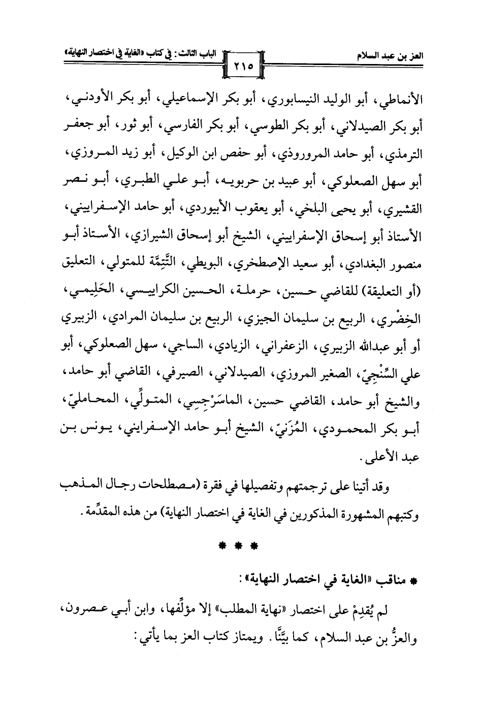 لم يُقدِمْ على اختصار "نهاية المطلب" إلا مؤلِّفها، وابن أبي عصرون، والعزُّ بن عبد السلام، كما بيَّنَّا. ويمتاز كتاب العز بما يأتي: