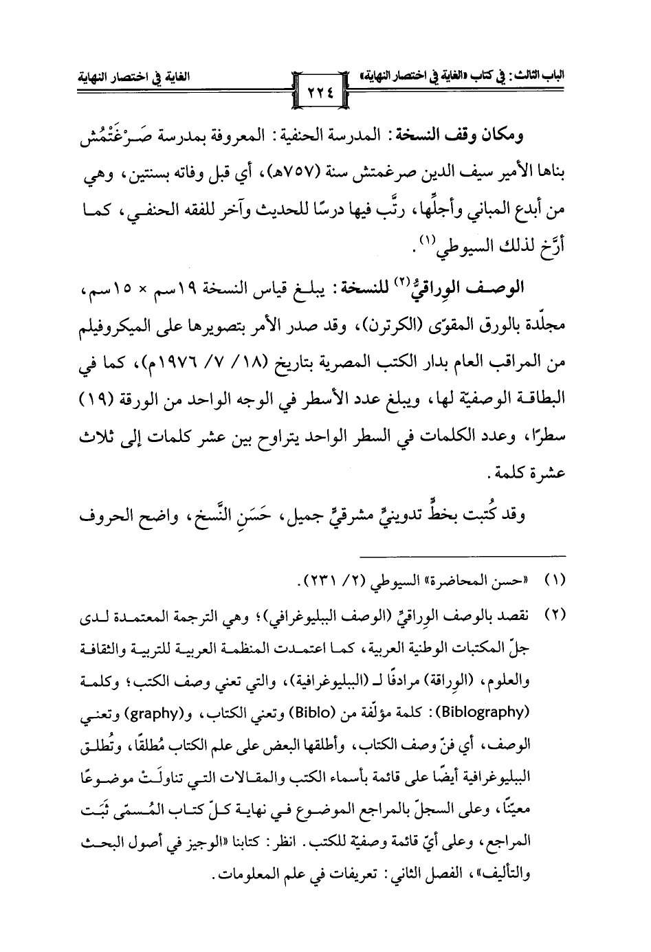 (¬2) نقصد بالوصف الوِراقيِّ (الوصف الببليوغرافي)؛ وهي الترجمة المعتمدة لدى جلّ المكتبات الوطنية العربية، كما اعتمدت المنظمة العربية للتربية والثقافة والعلوم، (الوِراقة) مرادفًا لـ (الببليوغرافية)، والتي تعني وصف الكتب؛ وكلمة (Biblography): كلمة مؤلّفة من (Biblo) وتعني الكتاب، و (graphy) وتعني الوصف، أي فن وصف الكتاب، وأطلقها البعض على علم الكتاب مُطلقًا، وتُطلق الببليوغرافية أيضًا على قائمة بأسماء الكتب والمقالات التي تناولَتْ موضوعًا معيَّنًا، وعلى السجل بالمراجع الموضوع في نهاية كل كتاب المُسمّى ثَبَت المراجع، وعلى أيّ قائمة وصفيّة للكتب. انظر: كتابنا "الوجيز في أصول البحث والتأليف"، الفصل الثاني: تعريفات في علم المعلومات.