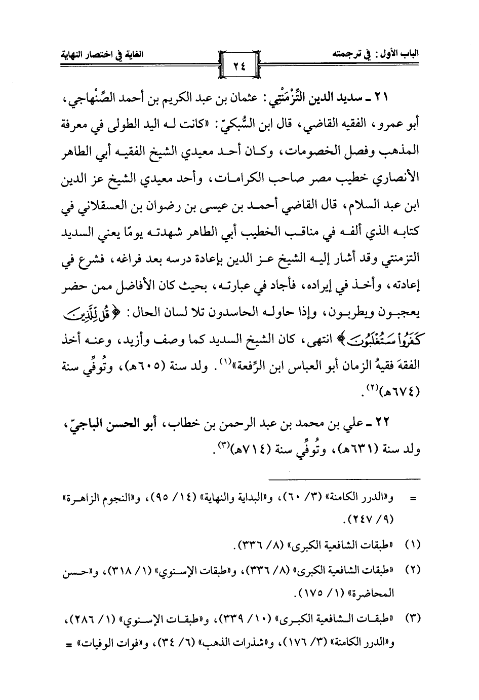 21 - سديد الدين التِّزْمَنْتِي: عثمان بن عبد الكريم بن أحمد الصِّنْهاجي، أبو عمرو، الفقيه القاضي، قال ابن السُّبكيّ: "كانت له اليد الطولى في معرفة المذهب وفصل الخصومات، وكان أحد معيدي الشيخ الفقيه أبي الطاهر الأنصاري خطيب مصر صاحب الكرامات، وأحد معيدي الشيخ عز الدين بن عبد السلام، قال القاضي أحمد بن عيسى بن رضوان بن العسقلاني في كتابه الذي ألفه في مناقب الخطيب أبي الطاهر شهدته يومًا يعني السديد التزمنتي وقد أشار إليه الشيخ عز الدين بإعادة درسه بعد فراغه، فشرع في إعادته، وأخذ في إيراده، فأجاد في عبارته، بحيث كان الأفاضل ممن حضر يعجبون ويطربون، وإذا حاوله الحاسدون تلا لسان الحال: {قُلْ لِلَّذِينَ كَفَرُوا سَتُغْلَبُونَ} انتهى، كان الشيخ السديد كما وصف وأزيد، وعنه أخذ الفقهَ فقيهُ الزمان أبو العباس ابن الرِّفعة" (¬1). ولد سنة (605 هـ)، وتُوفّي سنة (674 هـ) (¬2).