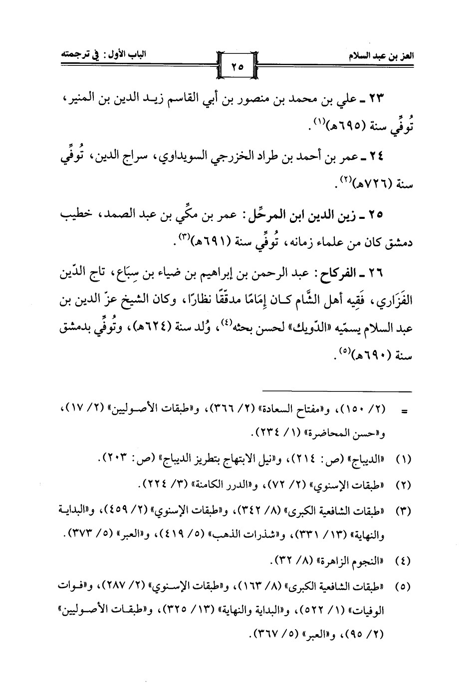 26 - الفركاح: عبد الرحمن بن إبراهيم بن ضياء بن سِبَاع، تاج الدّين الفَزَاري، فَقِيه أهل الشَّام كان إِمَامًا مدقّقًا نظارًا، وكان الشيخ عزّ الدين بن عبد السلام يسمّيه "الدّويك" لحسن بحثه (¬4)، وُلد سنة (624 هـ)، وتُوفّي بدمشق سنة (690 هـ) (¬5).