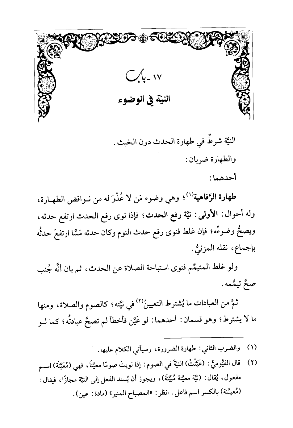 (¬2) قال الفيُّوميُّ: (عَيَّنْتُ) النيَّةَ في الصوم: إذا نويتَ صومًا معيَّنًا، فهي (مُعَيَّنَة) اسم مفعول، يُقال: (نيَّة معيَّنة مُبيَّنَة)، ويجوز أن يُسند الفعل إلى النيَّة مجازًا، فيقال: (مُعيَّنة) بالكسر اسم فاعل. انظر: "المصباح المنير" (مادة: عين).