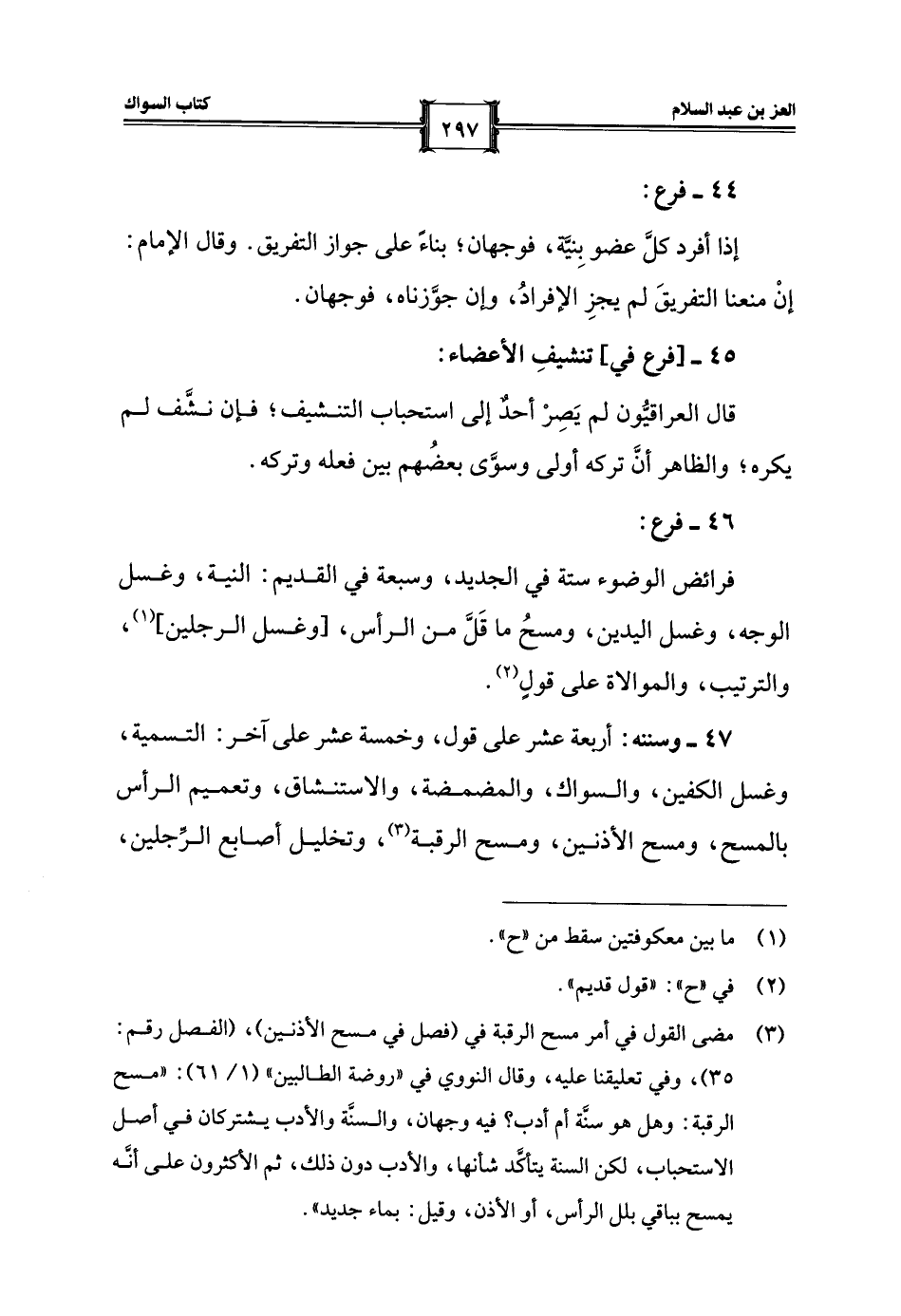 (¬3) مضى القول في أمر مسح الرقبة في (فصل في مسح الأذنين)، (الفصل رقم: 35)، وفي تعليقنا عليه، وقال النووي في "روضة الطالبين" (1/ 61): "مسح الرقبة: وهل هو سنَّة أم أدب؟ فيه وجهان، والسنَّة والأدب يشتركان في أصل الاستحباب، لكن السنة يتأكَّد شأنها، والأدب دون ذلك، ثم الأكثرون على أنَّه يمسح بباقي بلل الرأس، أو الأذن، وقيل: بماء جديد".