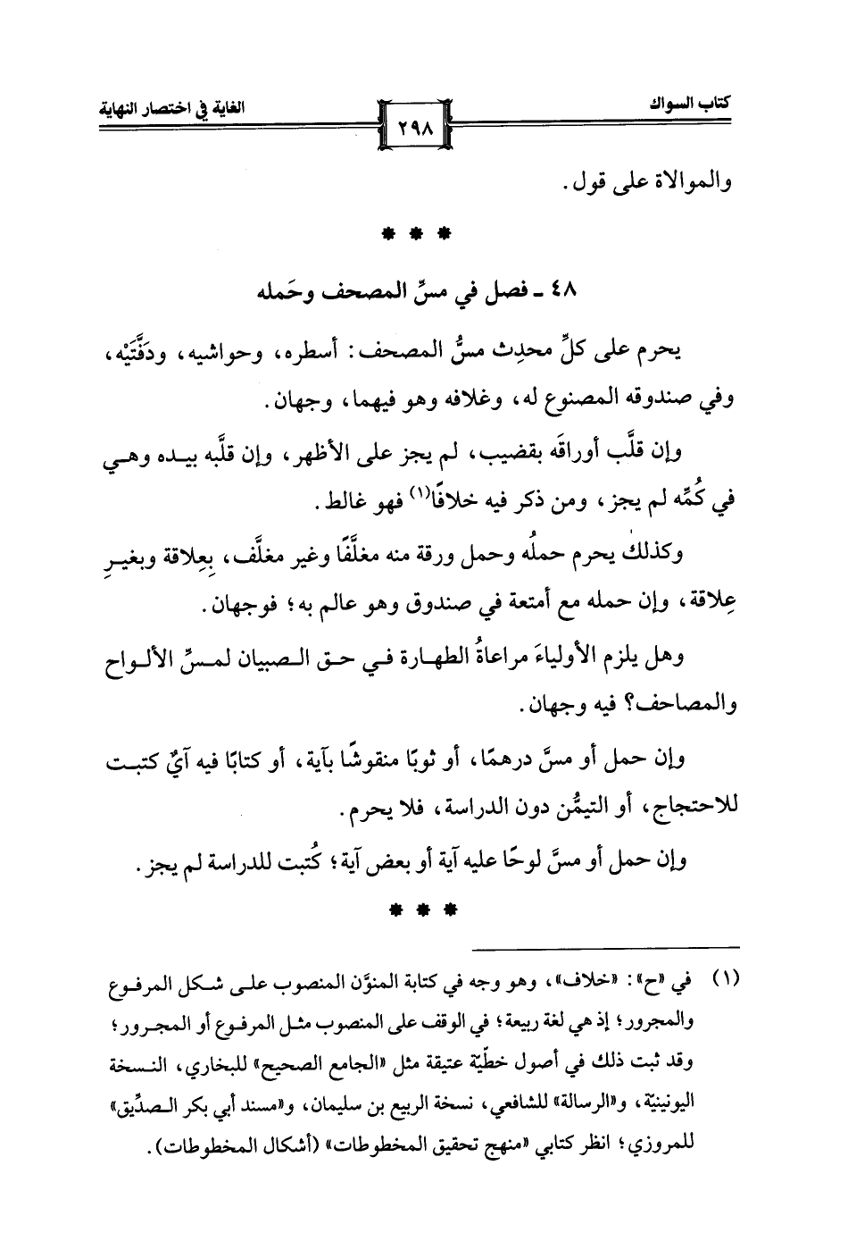 يحرم على كلِّ محدِث مسُّ المصحف: أسطره، وحواشيه، ودَفَّتَيْه، وفي صندوقه المصنوع له، وغلافه وهو فيهما، وجهان.
