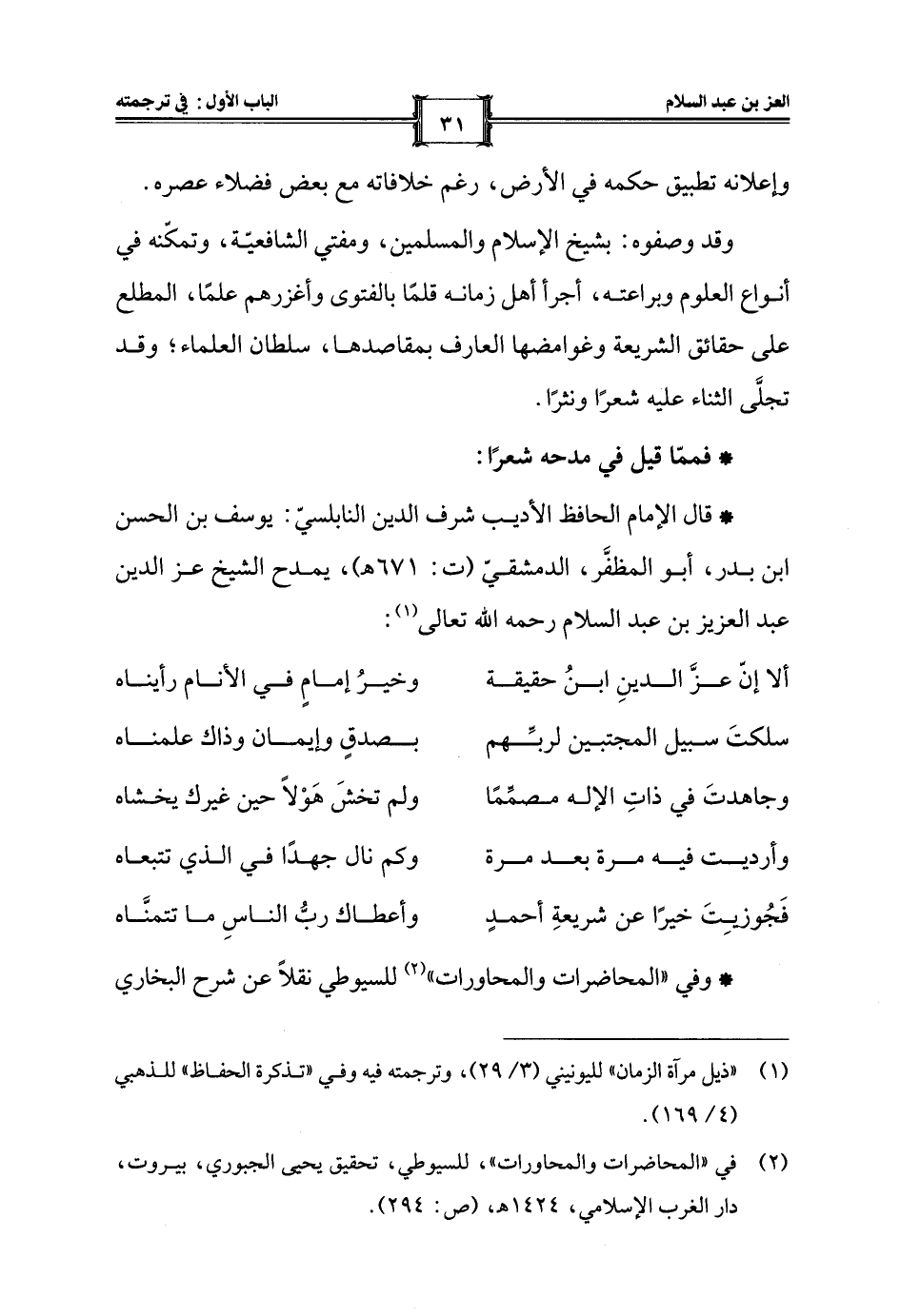 (¬2) في "المحاضرات والمحاورات"، للسيوطي، تحقيق يحيى الجبوري، بيروت، دار الغرب الإسلامي، 1424 هـ، (ص: 294).