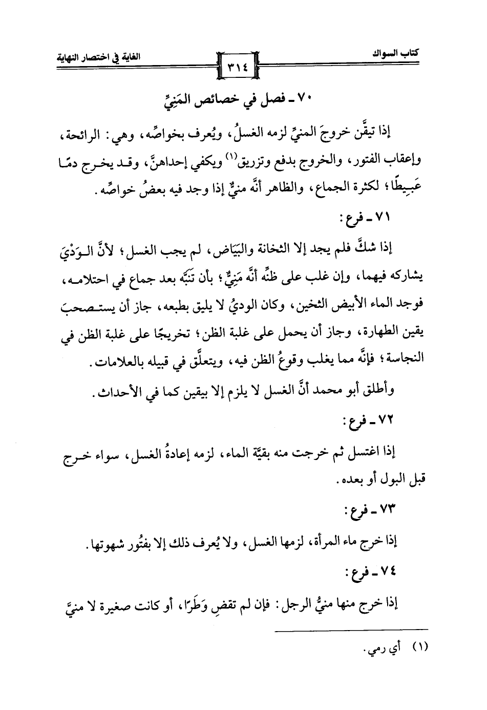 إذا تيقَّن خروجَ المنيِّ لزمه الغسلُ، ويُعرف بخواصِّه، وهي: الرائحة، وإعقاب الفتور، والخروج بدفع وتزريق (¬1) ويكفي إحداهنَّ، وقد يخرج دمًا عَبِيطًا؛ لكثرة الجماع، والظاهر أنَّه منيٌّ إذا وجد فيه بعضُ خواصِّه.