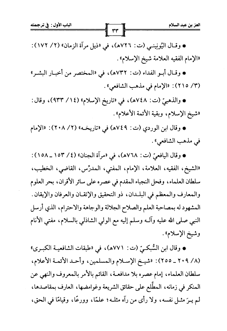 * وقال اليافعيّ (ت: 768 هـ)، في "مرآة الجنان" (4/ 153 - 158): "الشيخ، الفقيه، العلامة، الإمام، المفتي، المدرّس، القاضي، الخطيب، سلطان العلماء، وفحل النجباء المقدم في عصره على سائر الأقران، بحر العلوم والمعارف والمعظم في البلدان، ذو التحقيق والإتقان والعرفان والإيقان. المشهود له بمصاحبة العلم والصلاح الجلالة والوجاهة والاحترام، الذي أرسل النبي صلى الله عليه وآله وسلم إليه مع الولي الشاذلي بالسلام، مفتي الأنام وشيخ الإسلام".