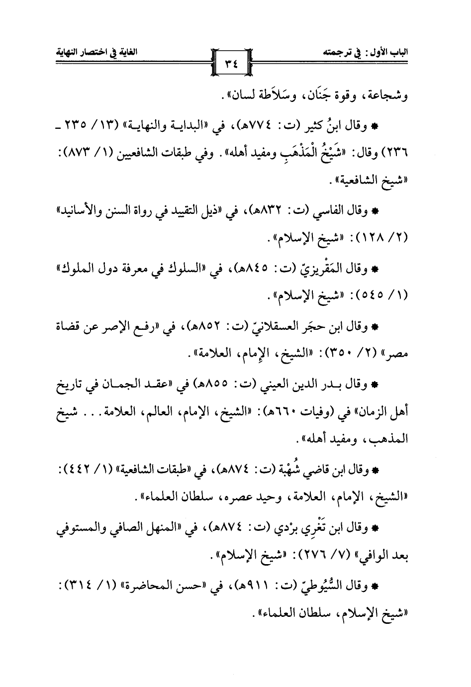 * وقال ابن حجَر العسقلانيّ (ت: 852 هـ)، في "رفع الإصر عن قضاة مصر" (2/ 350): "الشيخ، الإِمام، العلامة".