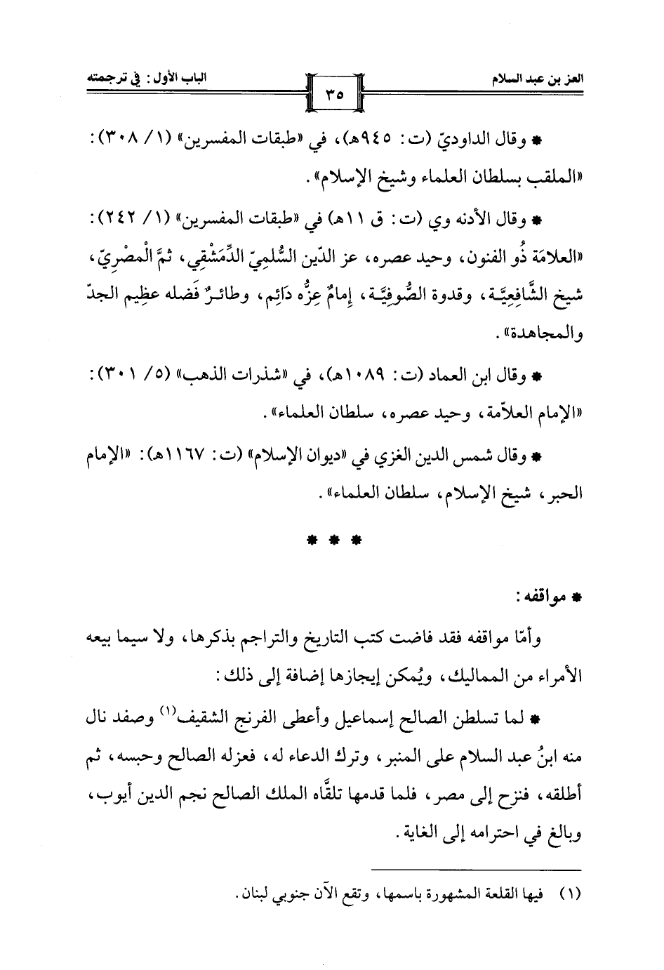 * وقال الداوديّ (ت: 945 هـ)، في "طبقات المفسرين" (1/ 308): "الملقب بسلطان العلماء وشيخ الإسلام".