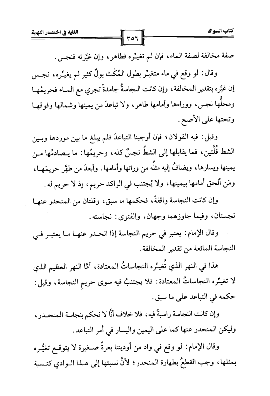 هذا في النهر الذي تُغيِّره النجاساتُ المعتادة، أمَّا النهر العظيم الذي لا تغيِّره النجاساتُ المعتادة: فلا يجتنبُ فيه سوى حريمِ النجاسة، وقيل: حكمه في التباعد على ما سبق.