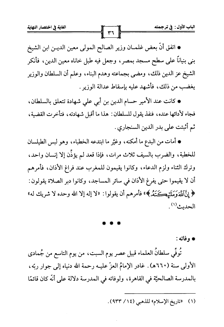 * اتفق أنّ بعض غلمان وزير الصالح المولى معين الدين ابن الشيخ بنى بنيانًا على سطح مسجد بمصر، وجعل فيه طبل خاناه معين الدين، فأنكر الشيخ عز الدين ذلك، ومضى بجماعته وهدم البناء، وعلم أن السلطان والوزير يغضب من ذلك، فأشهد عليه بإسقاط عدالة الوزير.