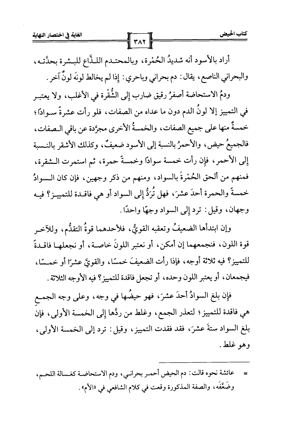 ودمُ الاستحاضة أصفرُ رقيق ضارب إِلى الشُّقْرة في الأغلب، ولا يعتبر في التمييز إلا لونُ الدم دون ما عداه من الصفات، فلو رأت عشرةً سوادًا؛ خمسةٌ منها على جميع الصفات، والخمسةُ الأخرى مجرَّدة عن باقي الصفات، فالجميعُ حيض، والأحمرُ بالنسبة إلى الأسود ضعيفٌ، وكذلك الأشقر بالنسبة إِلى الأحمر، فإِن رأت خمسة سوادًا وخمسةً سمرة، ثم استمرت الشقرة، فمنهم من ألحق الحُمْرةَ بالسواد، ومنهم من ذكر وجهين، فإن كان السوادُ خمسةً والحمرة أحدَ عشرَ، فهل تُرَدُّ إِلى السواد أو هي فاقدة للتمييز؟ فيه وجهان، وقيل: ترد إِلى السواد وجهًا واحدًا.