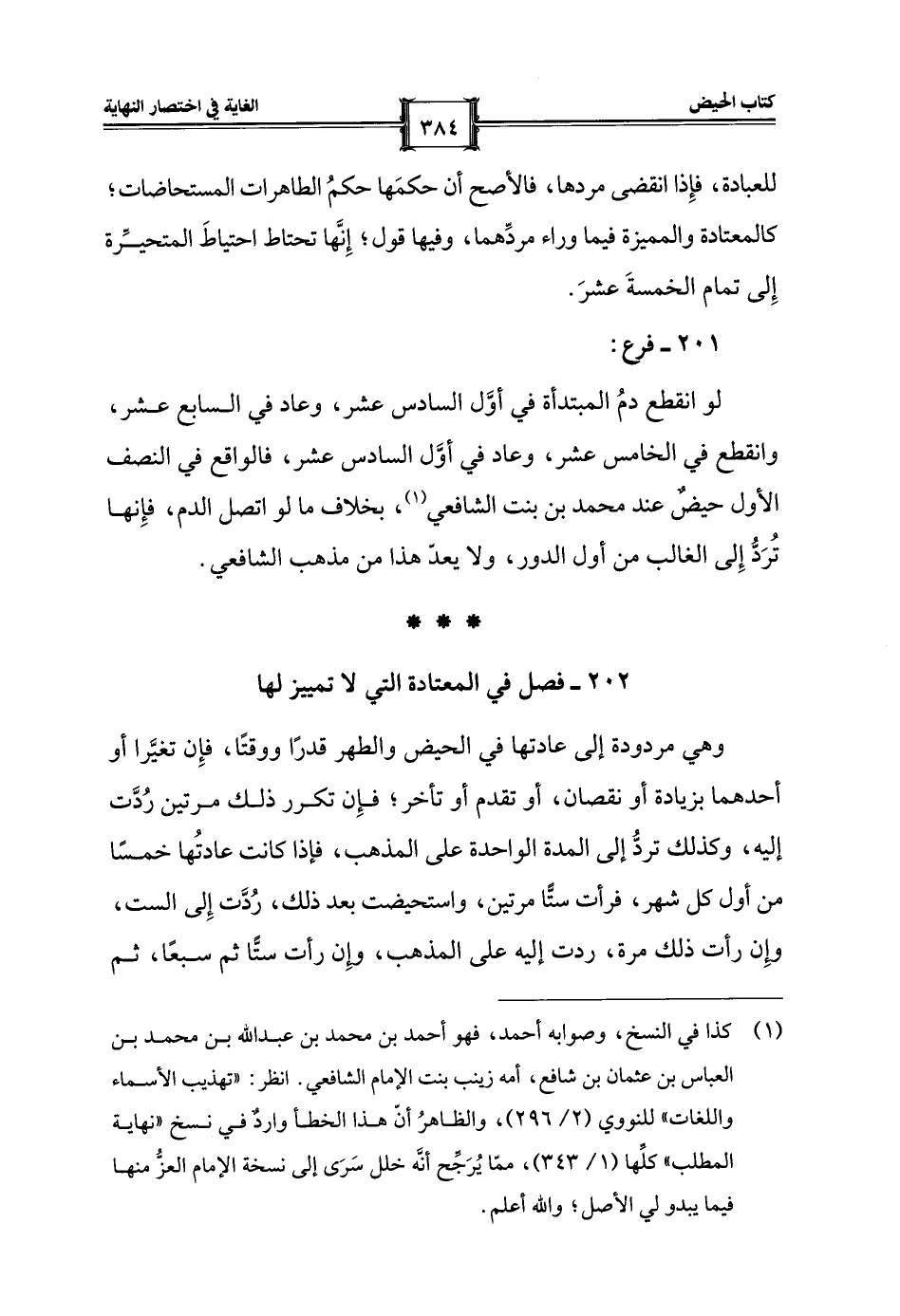 (¬1) كذا في النسخ، وصوابه أحمد، فهو أحمد بن محمد بن عبد الله بن محمد بن العباس بن عثمان بن شافع، أمه زينب بنت الإمام الشافعي. انظر: "تهذيب الأسماء واللغات" للنووي (2/ 296)، والظاهرُ أنّ هذا الخطأ واردٌ في نسخ "نهاية المطلب" كلِّها (1/ 343)، ممّا يُرَجِّح أنَّه خلل سَرَى إلى نسخة الإمام العزُّ منها فيما يبدو لي الأصل؛ والله أعلم.