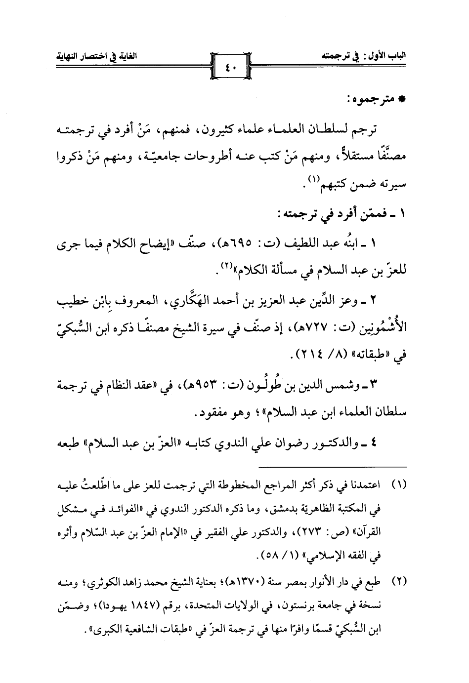 (¬1) اعتمدنا في ذكر أكثر المراجع المخطوطة التي ترجمت للعز على ما اطّلعتُ عليه في المكتبة الظاهريّة بدمشق، وما ذكره الدكتور الندوي في "الفوائد في مشكل القرآن" (ص: 273)، والدكتور علي الفقير في "الإمام العزّ بن عبد السّلام وأثره في الفقه الإسلامي" (1/ 58).