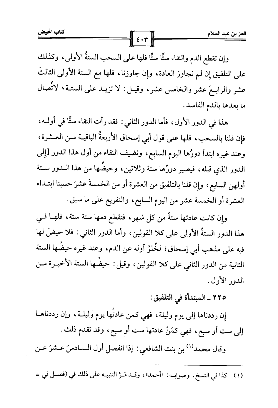 وإِن كانت عادتها ستةً من كل شهر، فتقطع دمها ستة ستة، فلها في هذا الدور الستةُ الأولى على كلا القولين، وأما الدور الثاني: فلا حيضَ لها فيه على مذهب أبي إسحاق؛ لخُلوِّ أوله عن الدم، وعند غيره حيضُها الستة الثانية من الدور الثاني على كلا القولين، وقيل: حيضُها الستة الأخيرة من الدور الأول.