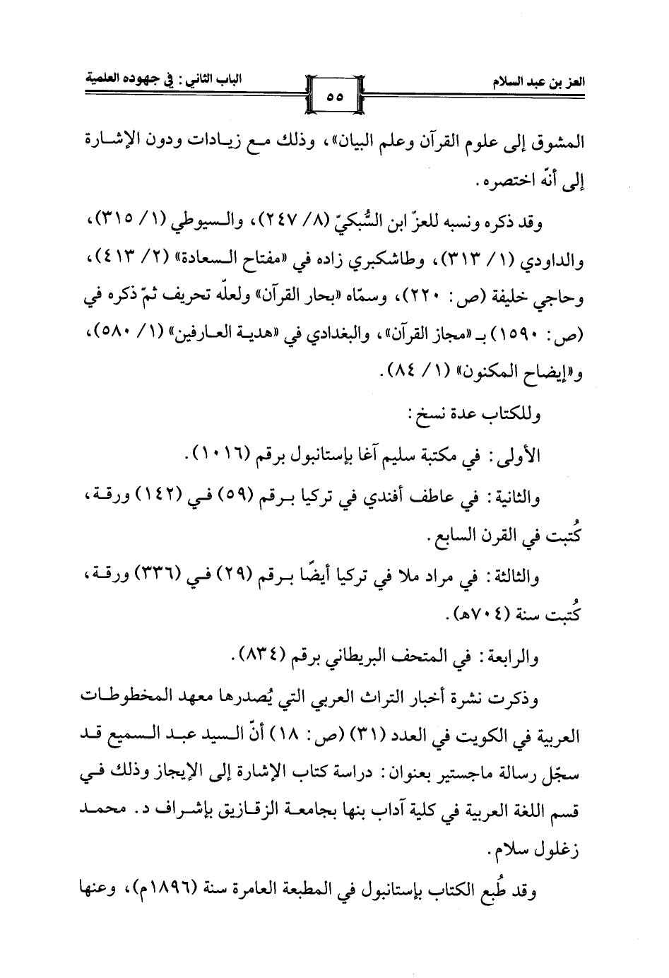 وقد ذكره ونسبه للعزّ ابنُ السُّبكيّ (8/ 247)، والسيوطي (1/ 315)، والداودي (1/ 313)، وطاشكبري زاده في "مفتاح السعادة" (2/ 413)، وحاجي خليفة (ص: 220)، وسمّاه "بحار القرآن" ولعلّه تحريف ثمّ ذكره في (ص: 1590) بـ "مجاز القرآن"، والبغدادي في "هدية العارفين" (1/ 580)، و"إيضاح المكنون" (1/ 84).
