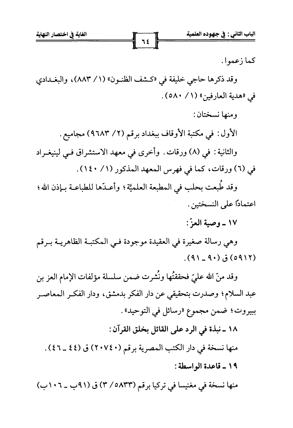 وهي رسالة صغيرة في العقيدة موجودة في المكتبة الظاهرية برقم (5912) ق (90 - 91).