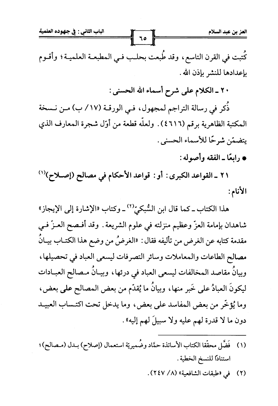 21 - القواعد الكبرى: أو: قواعد الأحكام في مصالح (إصلاح) (¬1) الأنام: هذا الكتاب - كما قال ابنُ السُّبكيّ (¬2) - وكتاب "الإشارة إلى الإيجاز" شاهدان بإمامة العز وعظيم منزلته في علوم الشريعة. وقد أفصح العزّ في مقدمة كتابه عن الغرض من تأليفه فقال: "الغرضُ من وضع هذا الكتاب بيانُ مصالح الطاعات والمعاملات وسائر التصرفات ليسعى العباد في تحصيلها، وبيانُ مقاصد المخالفات ليسعى العباد في درئها، وبيانُ مصالح العبادات ليكونَ العبادُ على خَبر منها، وبيانُ ما يُقدّم من بعض المصالح على بعض، وما يُؤخّر من بعض المفاسد على بعض، وما يدخل تحت اكتساب العبيد دون ما لا قدرة لهم عليه ولا سبيلَ لهم إليه".