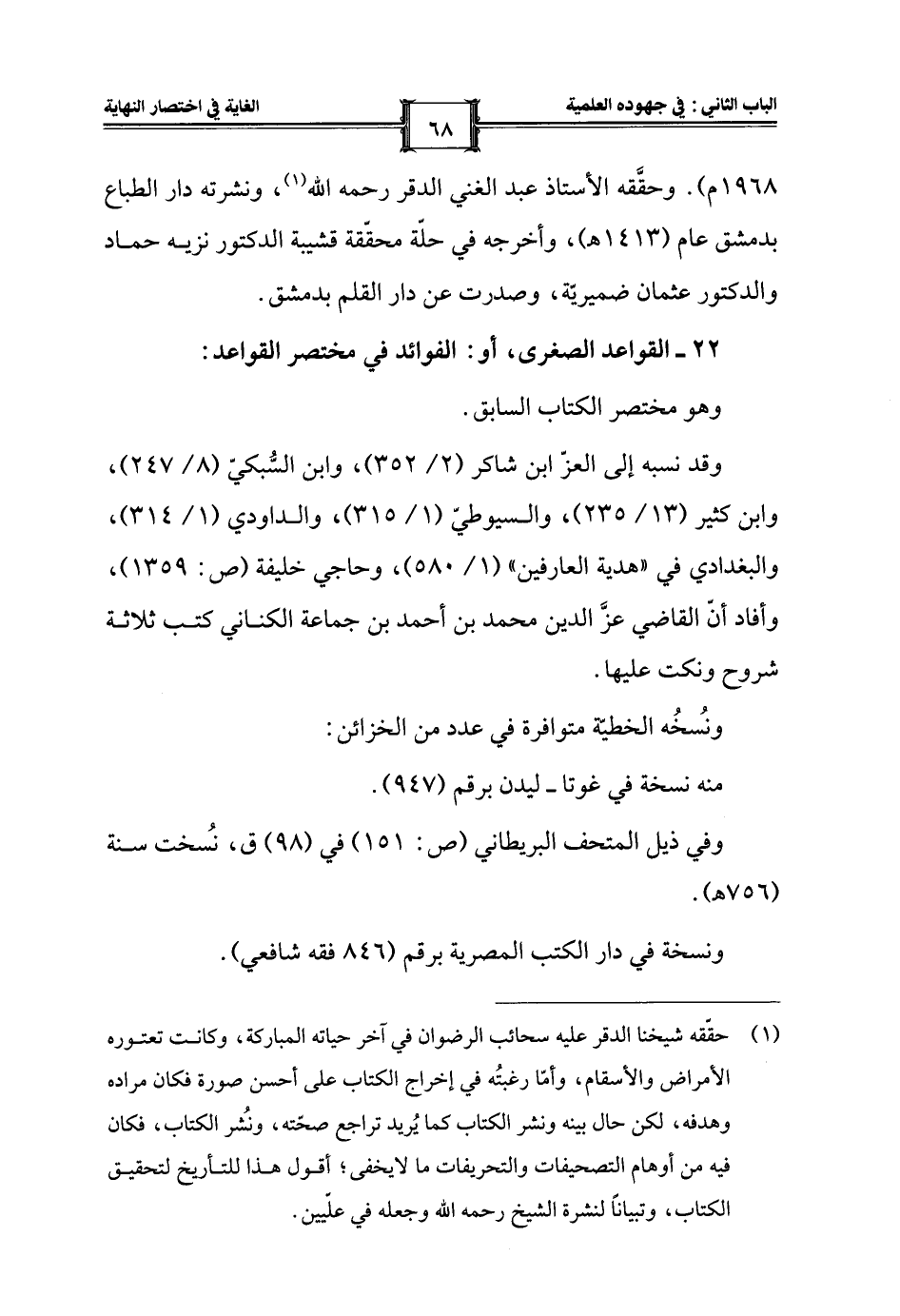 1968 م). وحقَّقه الأستاذ عبد الغني الدقر رحمه الله (¬1)، ونشرته دار الطباع بدمشق عام (1413 هـ)، وأخرجه في حلّة محقّقة قشيبة الدكتور نزيه حماد والدكتور عثمان ضميريّة، وصدرت عن دار القلم بدمشق.