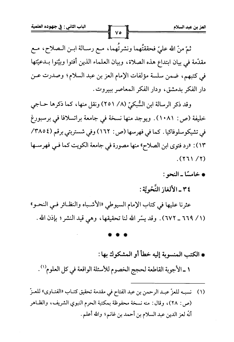 ثمّ منّ الله عليّ فحققتُهما ونشرتُهما، مع رسالة ابنُ الصلاح، مع مقدِّمة في بيان ابتداع هذه الصلاة، وبيان العلماء الذين أفتوا وبيَّنوا بدعيَّتها في كتبهم، ضمن سلسة مؤلفات الإمام العز بن عبد السلام؛ وصدرت عن دار الفكر بدمشق، ودار الفكر المعاصر ببيروت.