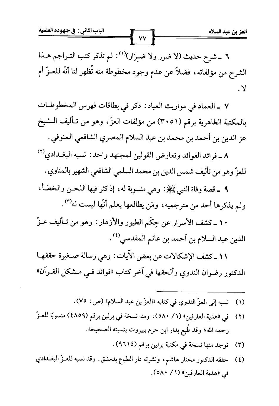 6 - شرح حديث (لا ضرر ولا ضِرَار) (¬1): لم تذكر كتب التراجم هذا الشرح من مؤلفاته، فضلًا عن عدم وجود مخطوطة منه تُظهر لنا أنَّه للعزّ أم لا.