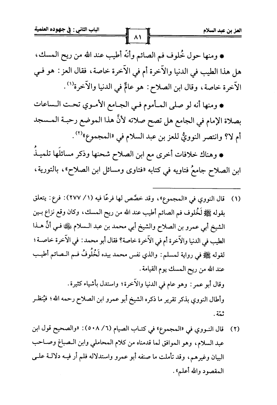 (¬2) قال النووي في "المجموع" في كتاب الصيام (6/ 508): "والصحيح قول ابنُ عبد السلام، وهو الموافق لما قدمناه من كلام المحاملي وابنُ الصباغ وصاحب البيان وغيرهم، وقد تأملت ما صنفه أبو عمرو واستدلاله فلم أر فيه دلالة على المقصود والله أعلم".