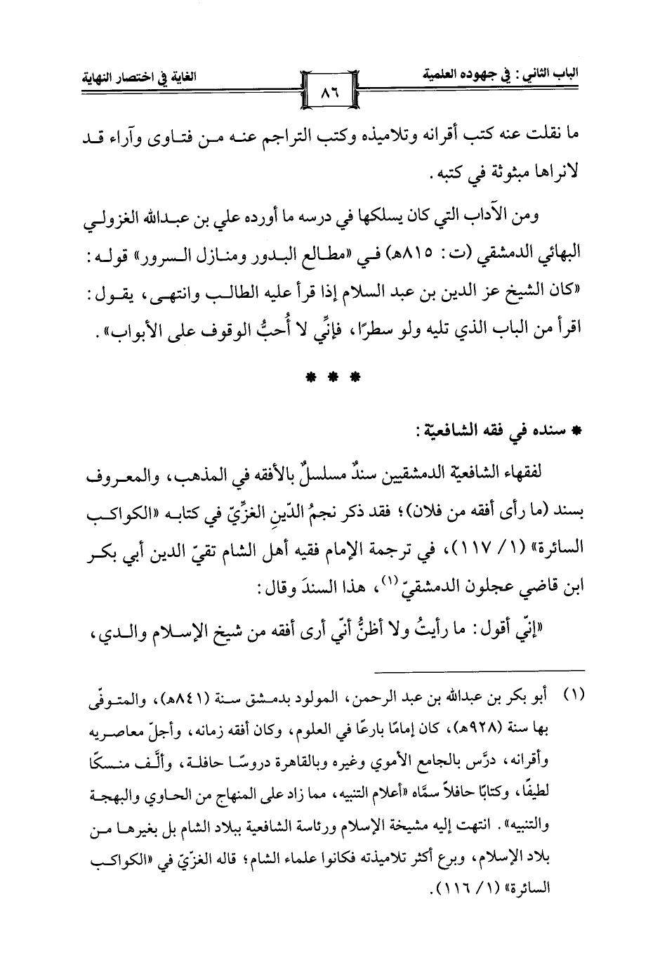 لفقهاء الشافعيَّة الدمشقيين سندٌ مسلسلٌ بالأفقه في المذهب، والمعروف بسند (ما رأى أفقه من فلان)؛ فقد ذكر نجمُ الدّينِ الغزِّيّ في كتابه "الكواكب السائرة" (1/ 117)، في ترجمة الإمام فقيه أهل الشام تقيّ الدين أبي بكر ابن قاضي عجلون الدمشقيّ (¬1)، هذا السندَ وقال: