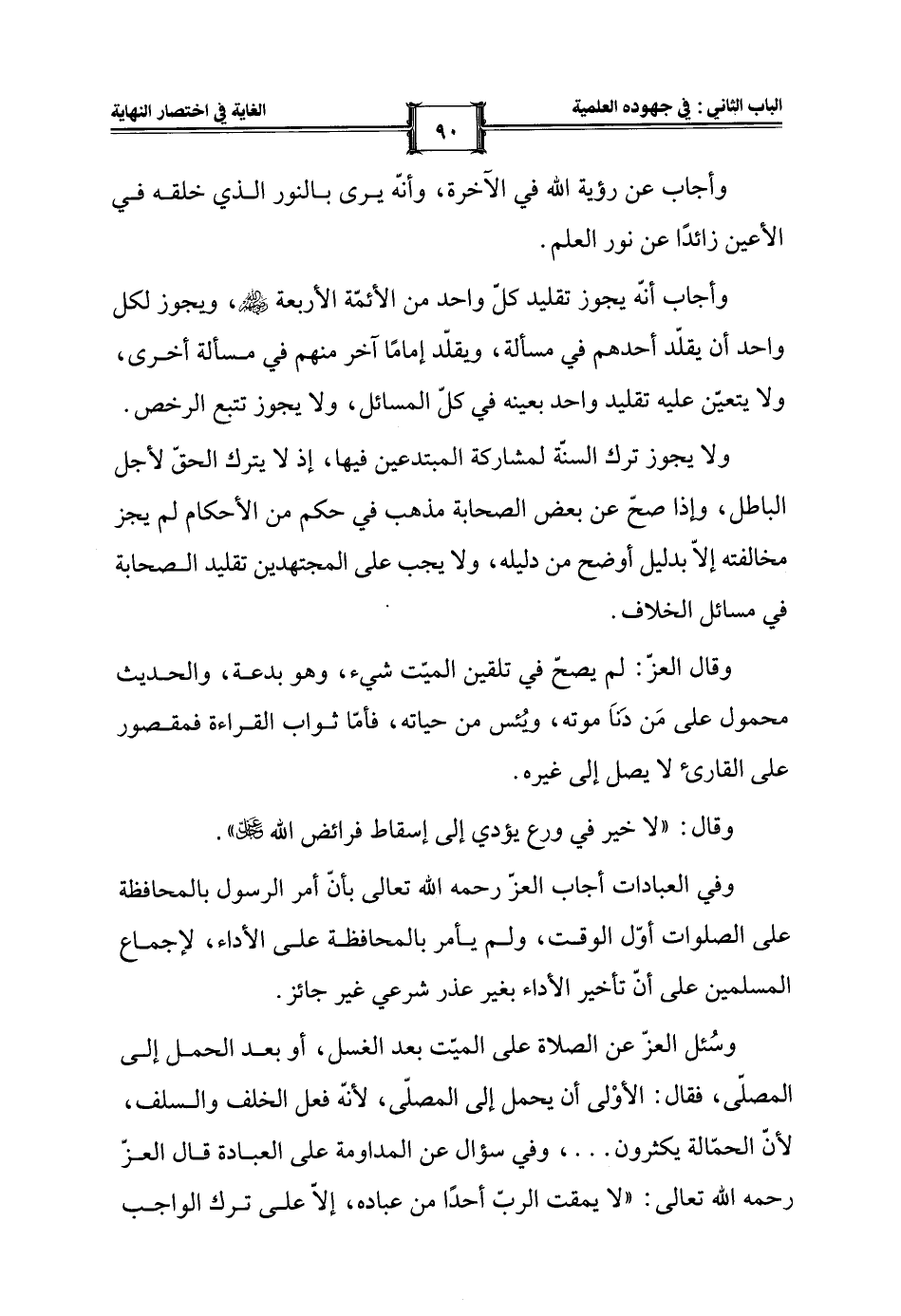 وسُئل العزّ عن الصلاة على الميّت بعد الغسل، أو بعد الحمل إلى المصلّى، فقال: الأوْلى أن يحمل إلى المصلّى؛ لأنهّ فعل الخلف والسلف، لأنّ الحمّالة يكثرون ... ، وفي سؤال عن المداومة على العبادة قال العزّ رحمه الله تعالى: "لا يمقت الربُّ أحدًا من عباده، إلَّا على ترك الواجب