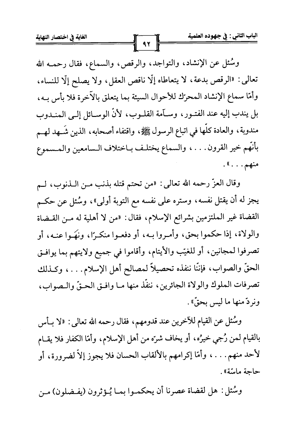 وقال العزّ رحمه الله تعالى: "من تحتم قتله بذنب من الذنوب، لم يجز له أن يقتل نفسه، وستره على نفسه مع التوبة أولى"، وسُئل عن حكم القضاة غير الملتزمين بشرائع الإسلام، فقال: "من لا أهلية له من القضاة والولاة، إذا حكموا بحق، وأمروا به، أو دفعوا منكرًا، ونهَوا عنه، أو تصرفو المجانين، أو للغيّب والأيتام، وأقاموا في جميع ولايتهم بما يوافق الحقّ والصواب، فإننا ننفذه تحصيلًا لمصالح أهل الإسلام ... ، وكذلك تصرفات الملوك والولاة الجائرين، ننفّذ منها ما وافق الحقّ والصواب، ونردّ منها ما ليس بحقّ".