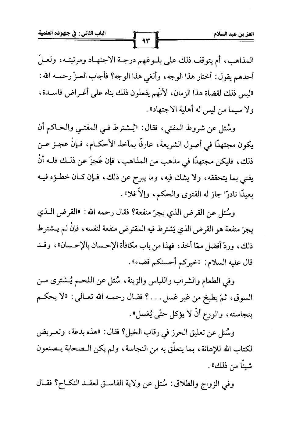 المذاهب، أم يتوقف ذلك على بلوغهم درجة الاجتهاد ومرتبته، ولعلّ أحدهم يقول: أختار هذا الوجه، وألغي هذا الوجه؟ فأجاب العزّ رحمه الله: "ليس ذلك لقضاة هذا الزمان؛ لأنَّهم يفعلون ذلك بناء على أغراض فاسدة، ولا سيما من ليس له أهلية الاجتهاد".