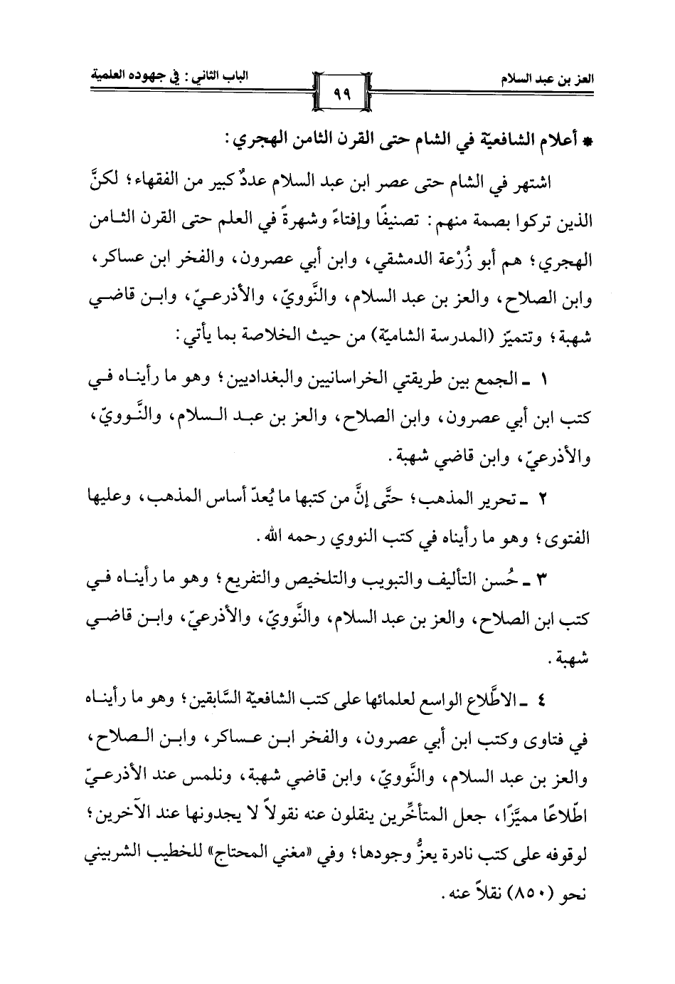 اشتهر في الشام حتى عصر ابن عبد السلام عددٌ كبير من الفقهاء؛ لكنَّ الذين تركوا بصمة منهم: تصنيفًا وإفتاءً وشهرةً في العلم حتى القرن الثامن الهجري؛ هم أبو زُرْعة الدمشقي، وابنُ أبي عصرون، والفخر ابن عساكر، وابنُ الصلاح، والعز بن عبد السلام، والنَّوويّ، والأذرعيّ، وابنُ قاضي شهبة؛ وتتميّز (المدرسة الشاميّة) من حيث الخلاصة بما يأتي: