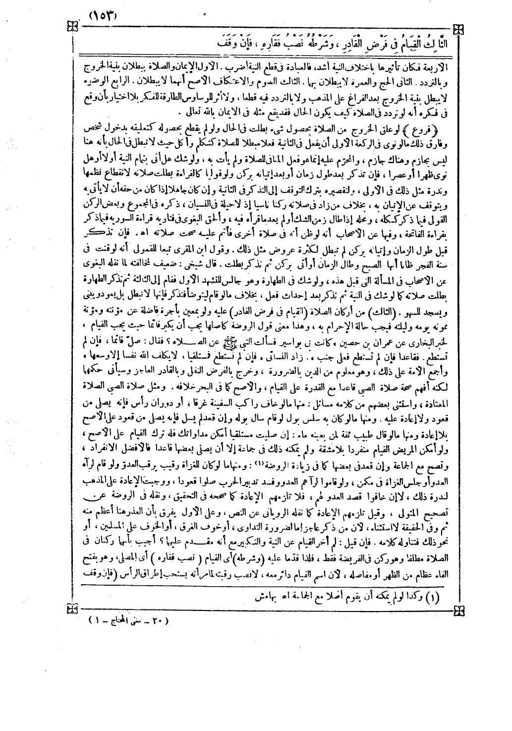 فإن قيل لم أخر القيام عن النية والتكبير مع أنه مقدم عليهما أجيب بأنهما ركنان في الصلاة مطلقا وهو ركن في الفريضة فقط فلذا قدما عليه