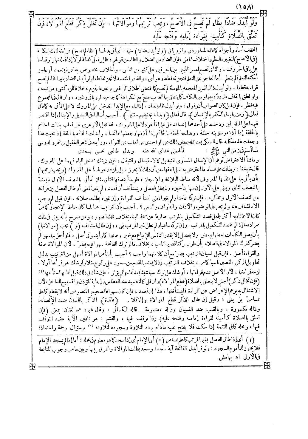 فإن قيل لم وجب الاستئناف هنا ولم يجب في الوضوء والأذان والطواف والسعي أجيب بأن الترتيب هنا لما كان مناط الإعجاز كما مر كان الاعتناء به أكثر فجعل قصد التكميل بالمرتب صارفا عن صحة البناء بخلاف تلك الصور ومن صرح بأنه يبني في ذلك مراده ما إذا لم يقصد التكميل بالمرتب وإن تركه ساهيا ولم يطل غير المرتب بنى وإن طال استأنف